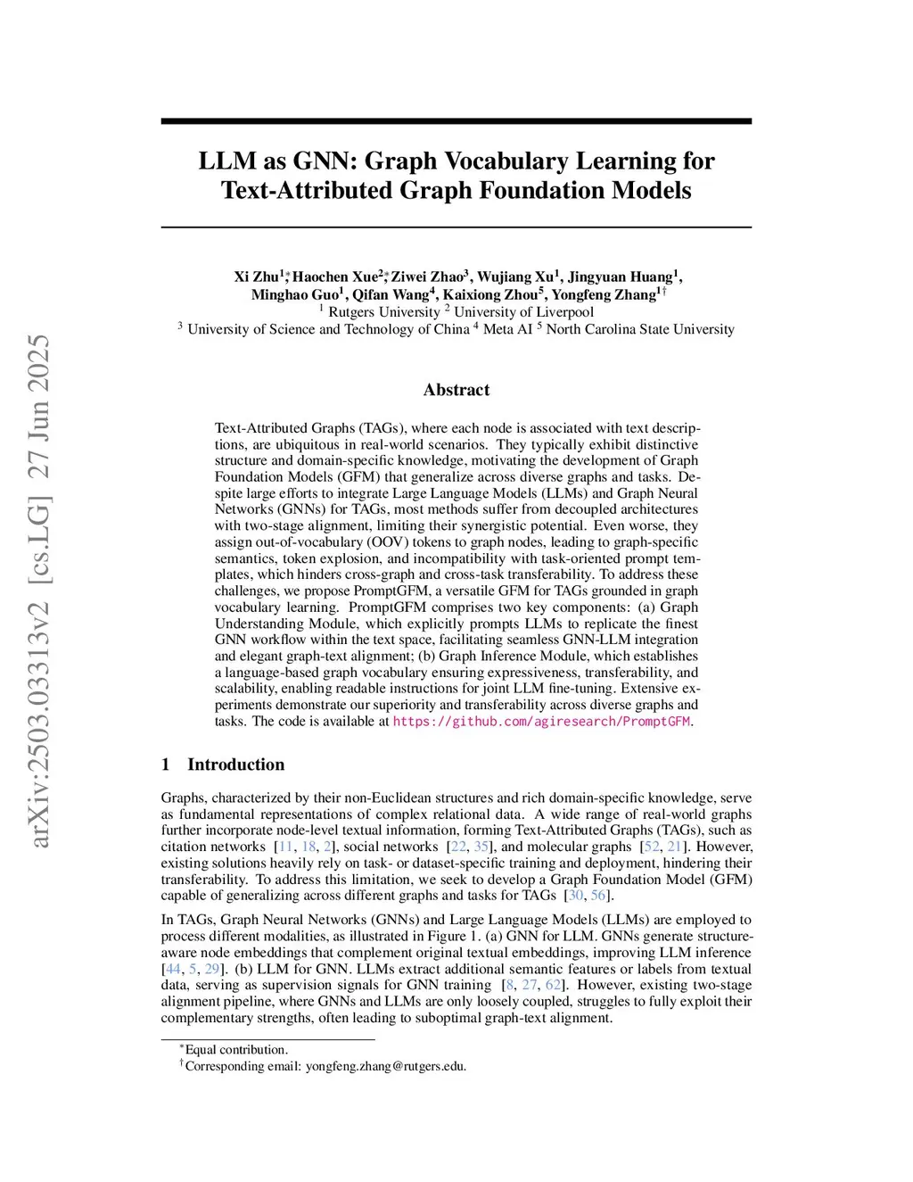 Text-Attributed Graphs (TAGs), where each node is associated with text descriptions, are ubiquitous in real-world scenarios. They typically exhibit distinctive structure and domain-specific knowledge, motivating the development of a Graph Foundation Model (GFM) that generalizes across diverse graphs and tasks. Despite large efforts to integrate Large Language Models (LLMs) and Graph Neural Networks (GNNs) for TAGs, existing approaches suffer from decoupled architectures with two-stage alignment, limiting their synergistic potential. Even worse, existing methods assign out-of-vocabulary (OOV) tokens to graph nodes, leading to graph-specific semantics, token explosion, and incompatibility with task-oriented prompt templates, which hinders cross-graph and cross-task transferability. To address these challenges, we propose PromptGFM, a versatile GFM for TAGs grounded in graph vocabulary learning. PromptGFM comprises two key components: (1) Graph Understanding Module, which explicitly prompts LLMs to replicate the finest GNN workflow within the text space, facilitating seamless GNN-LLM integration and elegant graph-text alignment; (2) Graph Inference Module, which establishes a language-based graph vocabulary ensuring expressiveness, transferability, and scalability, enabling readable instructions for LLM fine-tuning. Extensive experiments demonstrate our superiority and transferability across diverse graphs and tasks. The code is available at this:this https URL.