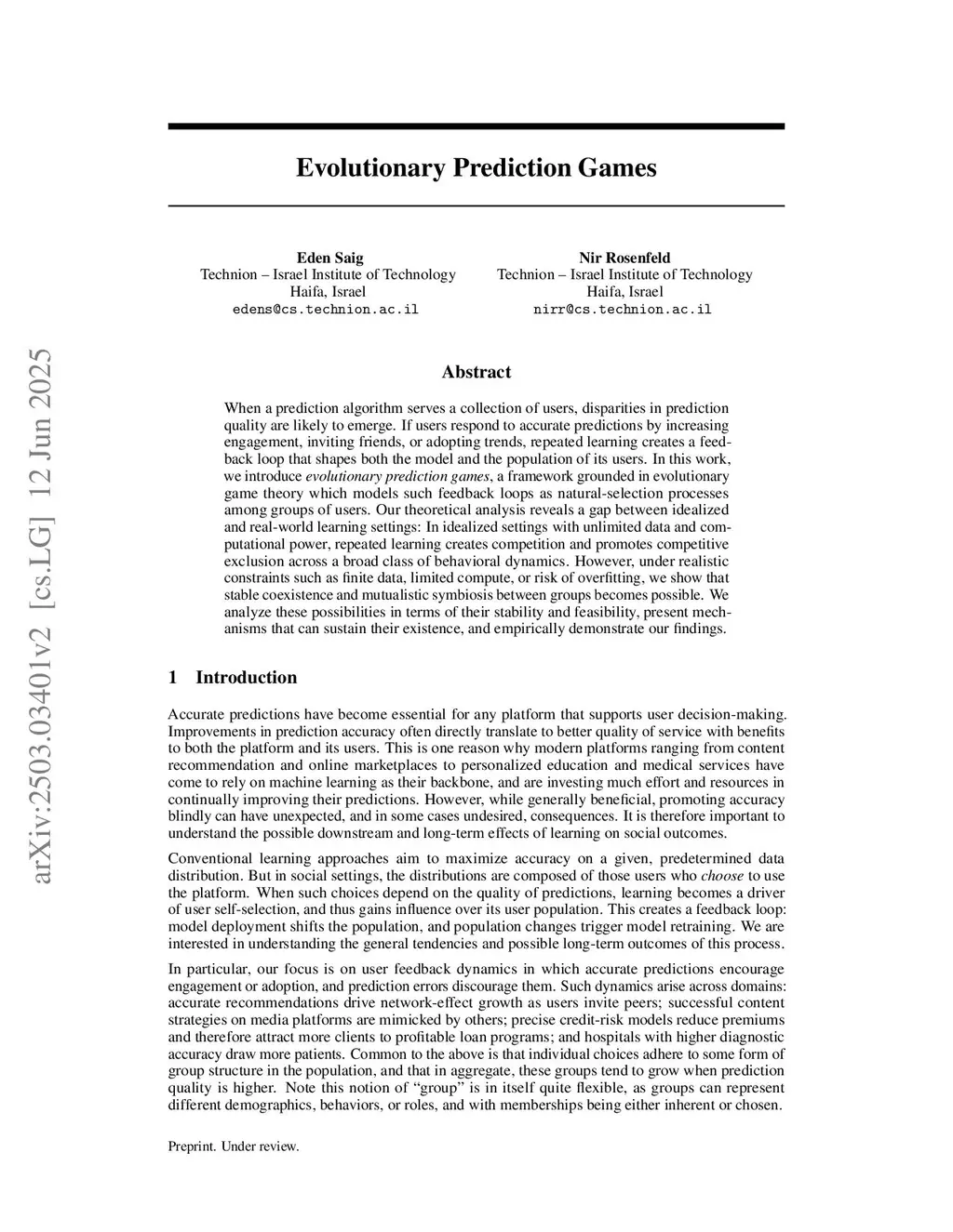 When a prediction algorithm serves a collection of users, disparities in prediction quality are likely to emerge. If users respond to accurate predictions by increasing engagement, inviting friends, or adopting trends, repeated learning creates a feedback loop that shapes both the model and the population of its users. In this work, we introduce evolutionary prediction games, a framework grounded in evolutionary game theory which models such feedback loops as natural-selection processes among groups of users. Our theoretical analysis reveals a gap between idealized and real-world learning settings: In idealized settings with unlimited data and computational power, repeated learning creates competition and promotes competitive exclusion across a broad class of behavioral dynamics. However, under realistic constraints such as finite data, limited compute, or risk of overfitting, we show that stable coexistence and mutualistic symbiosis between groups becomes possible. We analyze these possibilities in terms of their stability and feasibility, present mechanisms that can sustain their existence, and empirically demonstrate our findings.
