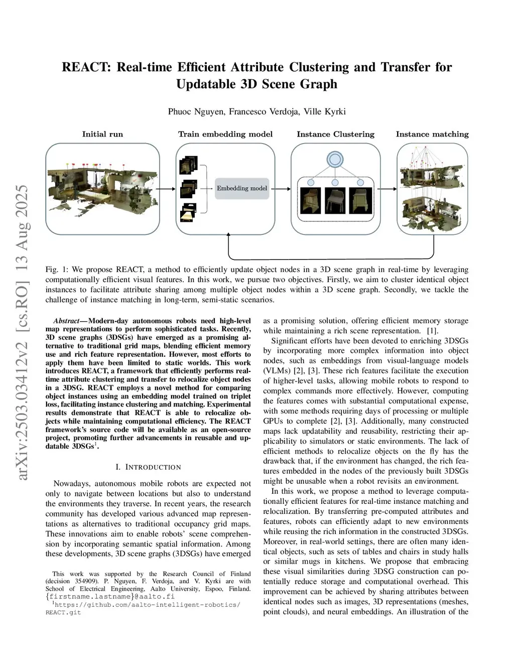 Modern-day autonomous robots need high-level map representations to perform sophisticated tasks. Recently, 3D scene graphs (3DSGs) have emerged as a promising alternative to traditional grid maps, blending efficient memory use and rich feature representation. However, most efforts to apply them have been limited to static worlds. This work introduces REACT, a framework that efficiently performs real-time attribute clustering and transfer to relocalize object nodes in a 3DSG. REACT employs a novel method for comparing object instances using an embedding model trained on triplet loss, facilitating instance clustering and matching. Experimental results demonstrate that REACT is able to relocalize objects while maintaining computational efficiency. The REACT framework's source code will be available as an open-source project, promoting further advancements in reusable and updatable 3DSGs.