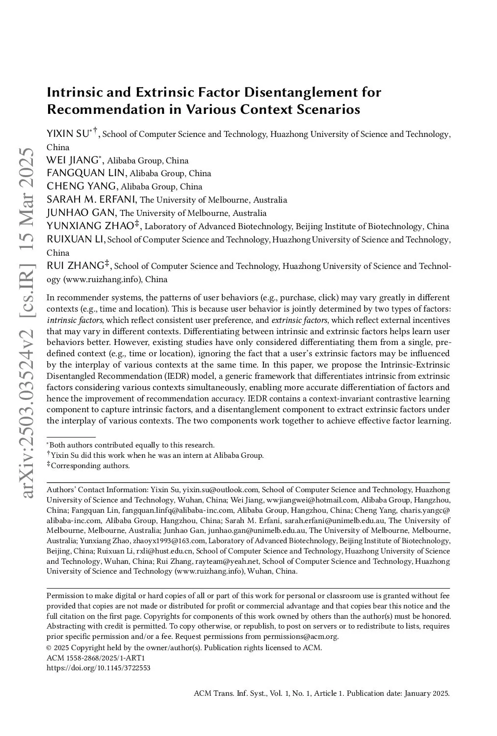 Intrinsic and Extrinsic Factor Disentanglement for Recommendation in Various Context Scenarios