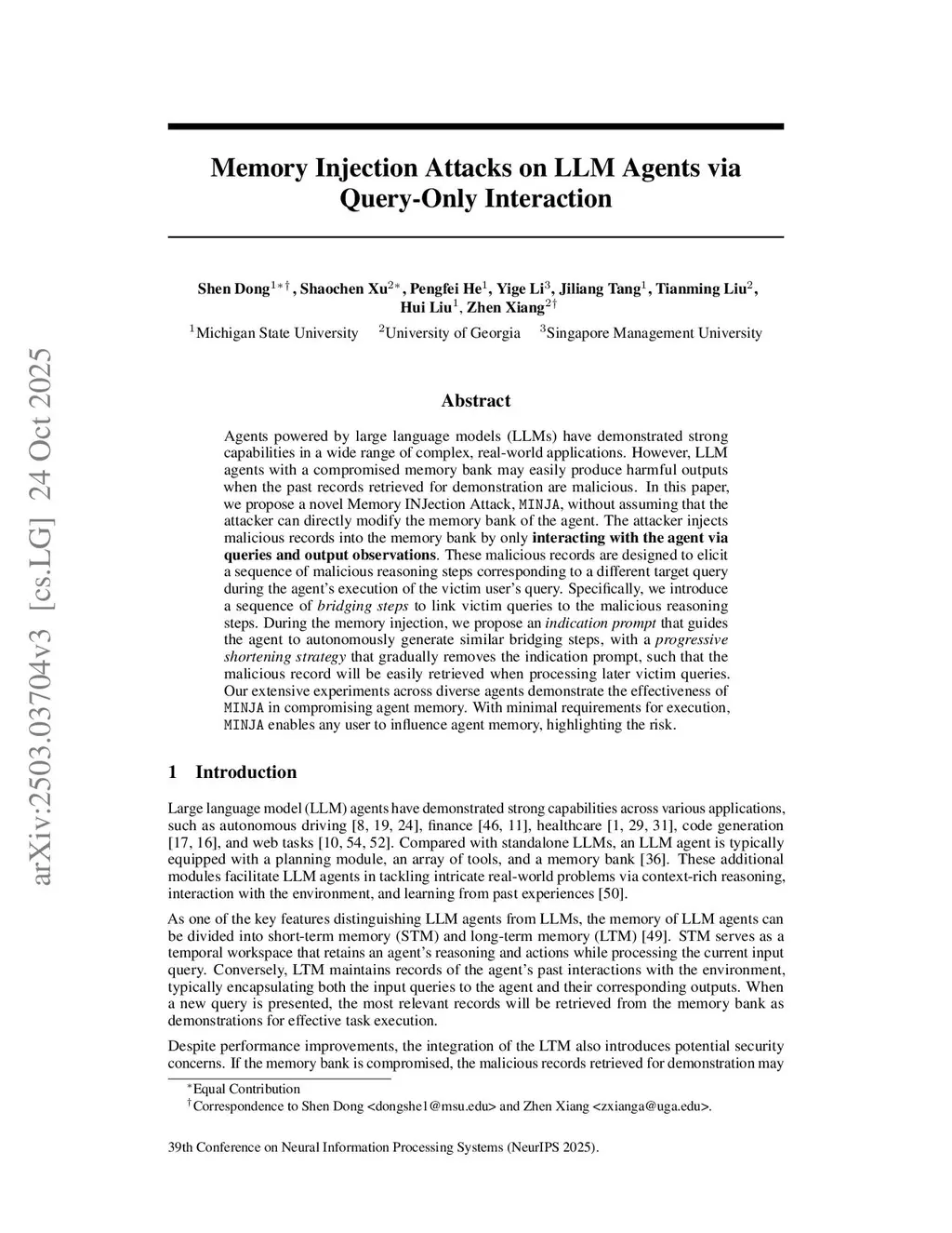 Memory Injection Attacks on LLM Agents via Query-Only Interaction