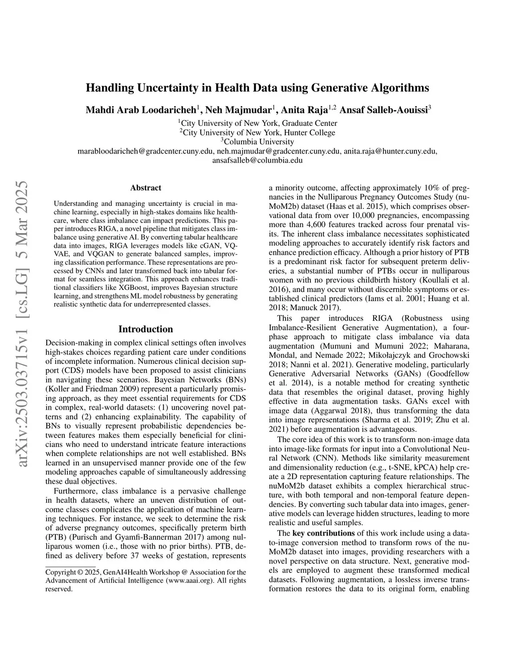 Understanding and managing uncertainty is crucial in machine learning, especially in high-stakes domains like healthcare, where class imbalance can impact predictions. This paper introduces RIGA, a novel pipeline that mitigates class imbalance using generative AI. By converting tabular healthcare data into images, RIGA leverages models like cGAN, VQVAE, and VQGAN to generate balanced samples, improving classification performance. These representations are processed by CNNs and later transformed back into tabular format for seamless integration. This approach enhances traditional classifiers like XGBoost, improves Bayesian structure learning, and strengthens ML model robustness by generating realistic synthetic data for underrepresented classes.