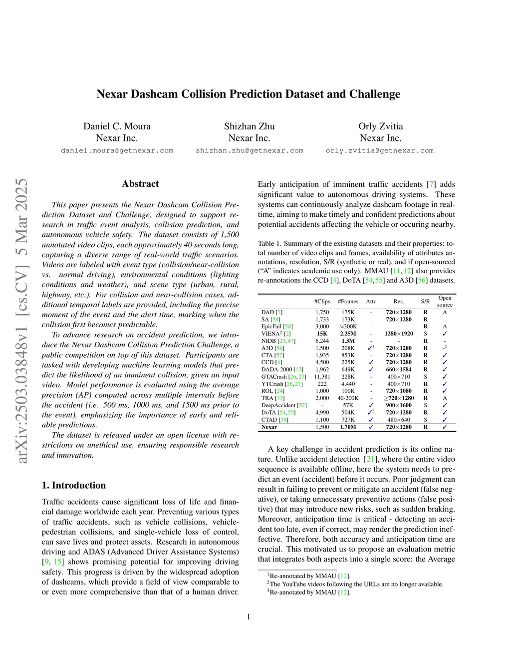 This paper presents the Nexar Dashcam Collision Prediction Dataset and Challenge, designed to support research in traffic event analysis, collision prediction, and autonomous vehicle safety. The dataset consists of 1,500 annotated video clips, each approximately 40 seconds long, capturing a diverse range of real-world traffic scenarios. Videos are labeled with event type (collision/near-collision vs. normal driving), environmental conditions (lighting conditions and weather), and scene type (urban, rural, highway, etc.). For collision and near-collision cases, additional temporal labels are provided, including the precise moment of the event and the alert time, marking when the collision first becomes predictable.To advance research on accident prediction, we introduce the Nexar Dashcam Collision Prediction Challenge, a public competition on top of this dataset. Participants are tasked with developing machine learning models that predict the likelihood of an imminent collision, given an input video. Model performance is evaluated using the average precision (AP) computed across multiple intervals before the accident (i.e. 500 ms, 1000 ms, and 1500 ms prior to the event), emphasizing the importance of early and reliable predictions.The dataset is released under an open license with restrictions on unethical use, ensuring responsible research and innovation.