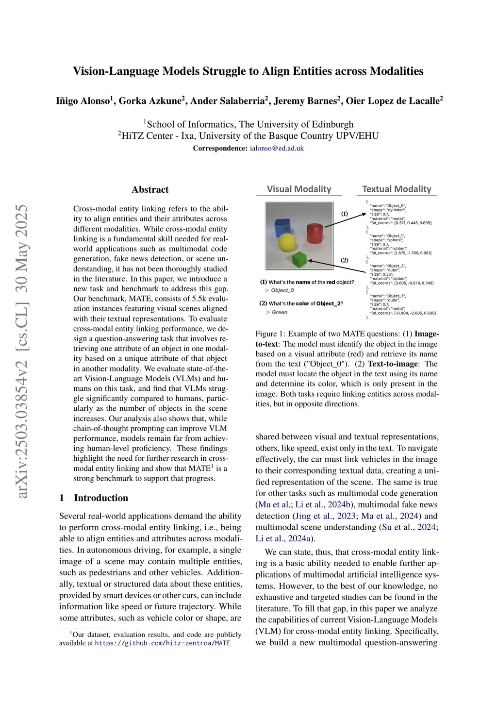 Cross-modal entity linking refers to the ability to align entities and their attributes across different modalities. While cross-modal entity linking is a fundamental skill needed for real-world applications such as multimodal code generation, fake news detection, or scene understanding, it has not been thoroughly studied in the literature. In this paper, we introduce a new task and benchmark to address this gap. Our benchmark, MATE, consists of 5.5k evaluation instances featuring visual scenes aligned with their textual representations. To evaluate cross-modal entity linking performance, we design a question-answering task that involves retrieving one attribute of an object in one modality based on a unique attribute of that object in another modality. We evaluate state-of-the-art Vision-Language Models (VLMs) and humans on this task, and find that VLMs struggle significantly compared to humans, particularly as the number of objects in the scene increases. Our analysis also shows that, while chain-of-thought prompting can improve VLM performance, models remain far from achieving human-level proficiency. These findings highlight the need for further research in cross-modal entity linking and show that MATE is a strong benchmark to support that progress.