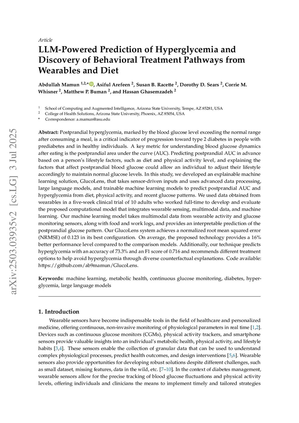 Postprandial hyperglycemia, marked by the blood glucose level exceeding the normal range after consuming a meal, is a critical indicator of progression toward type 2 diabetes in people with prediabetes and in healthy individuals. A key metric for understanding blood glucose dynamics after eating is the postprandial area under the curve (AUC). Predicting postprandial AUC in advance based on a person's lifestyle factors, such as diet and physical activity level, and explaining the factors that affect postprandial blood glucose could allow an individual to adjust their lifestyle accordingly to maintain normal glucose levels. In this study, we developed an explainable machine learning solution, GlucoLens, that takes sensor-driven inputs and uses advanced data processing, large language models, and trainable machine learning models to predict postprandial AUC and hyperglycemia from diet, physical activity, and recent glucose patterns. We used data obtained from wearables in a five-week clinical trial of 10 adults who worked full-time to develop and evaluate the proposed computational model that integrates wearable sensing, multimodal data, and machine learning. Our machine learning model takes multimodal data from wearable activity and glucose monitoring sensors, along with food and work logs, and provides an interpretable prediction of the postprandial glucose pattern. Our GlucoLens system achieves a normalized root mean squared error (NRMSE) of 0.123 in its best configuration. On average, the proposed technology provides a 16% better performance level compared to the comparison models. Additionally, our technique predicts hyperglycemia with an accuracy of 73.3% and an F1 score of 0.716 and recommends different treatment options to help avoid hyperglycemia through diverse counterfactual explanations. Code available:this https URL.