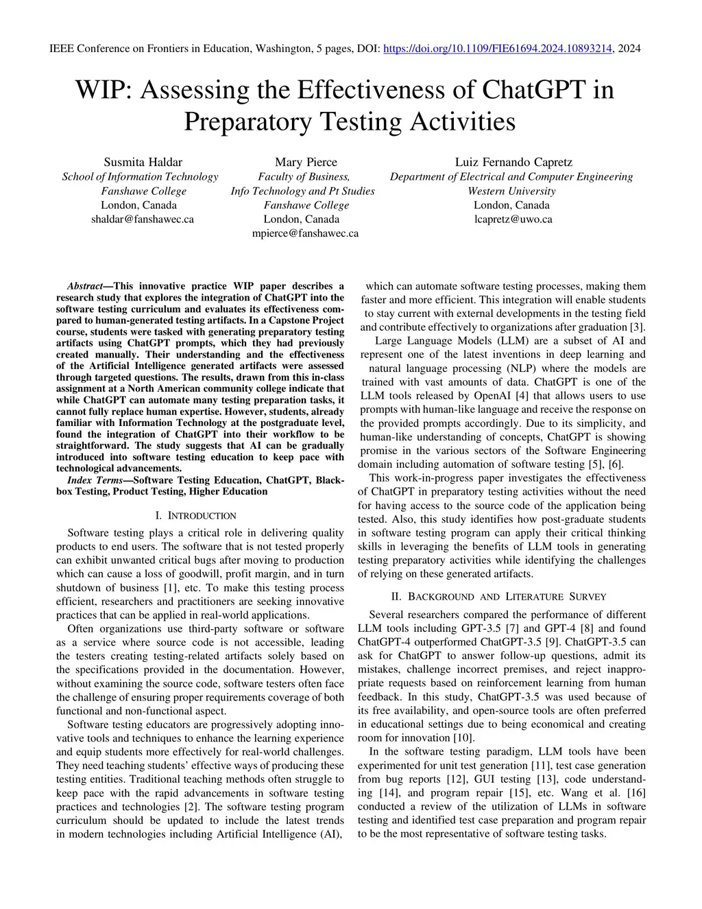 This innovative practice WIP paper describes a research study that explores the integration of ChatGPT into the software testing curriculum and evaluates its effectiveness compared to human-generated testing artifacts. In a Capstone Project course, students were tasked with generating preparatory testing artifacts using ChatGPT prompts, which they had previously created manually. Their understanding and the effectiveness of the Artificial Intelligence generated artifacts were assessed through targeted questions. The results, drawn from this in-class assignment at a North American community college indicate that while ChatGPT can automate many testing preparation tasks, it cannot fully replace human expertise. However, students, already familiar with Information Technology at the postgraduate level, found the integration of ChatGPT into their workflow to be straightforward. The study suggests that AI can be gradually introduced into software testing education to keep pace with technological advancements.