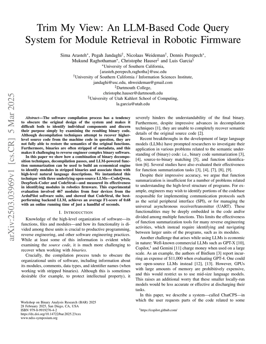 The software compilation process has a tendency to obscure the original design of the system and makes it difficult both to identify individual components and discern their purpose simply by examining the resulting binary code. Although decompilation techniques attempt to recover higher-level source code from the machine code in question, they are not fully able to restore the semantics of the original functions. Furthermore, binaries are often stripped of metadata, and this makes it challenging to reverse engineer complex binary software.In this paper we show how a combination of binary decomposition techniques, decompilation passes, and LLM-powered function summarization can be used to build an economical engine to identify modules in stripped binaries and associate them with high-level natural language descriptions. We instantiated this technique with three underlying open-source LLMs -- CodeQwen, DeepSeek-Coder and CodeStral -- and measured its effectiveness in identifying modules in robotics firmware. This experimental evaluation involved 467 modules from four devices from the ArduPilot software suite, and showed that CodeStral, the best-performing backend LLM, achieves an average F1-score of 0.68 with an online running time of just a handful of seconds.