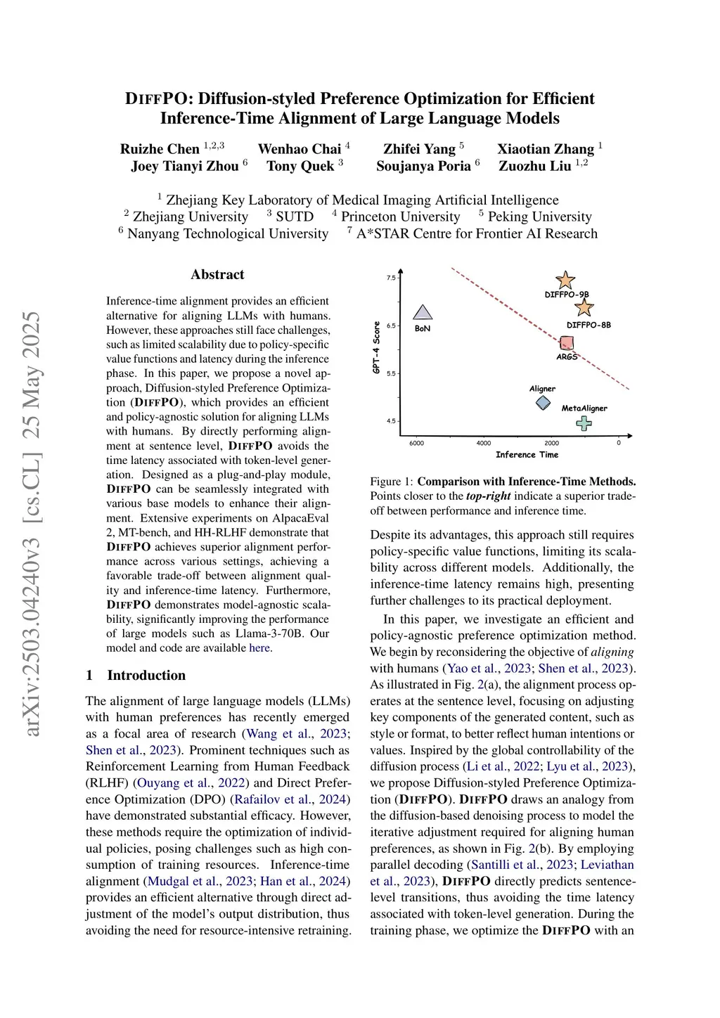 Inference-time alignment provides an efficient alternative for aligning LLMs with humans. However, these approaches still face challenges, such as limited scalability due to policy-specific value functions and latency during the inference phase. In this paper, we propose a novel approach, Diffusion-styled Preference Optimization (\model), which provides an efficient and policy-agnostic solution for aligning LLMs with humans. By directly performing alignment at sentence level, \model~avoids the time latency associated with token-level generation. Designed as a plug-and-play module, \model~can be seamlessly integrated with various base models to enhance their alignment. Extensive experiments on AlpacaEval 2, MT-bench, and HH-RLHF demonstrate that \model~achieves superior alignment performance across various settings, achieving a favorable trade-off between alignment quality and inference-time latency. Furthermore, \model~demonstrates model-agnostic scalability, significantly improving the performance of large models such as Llama-3-70B.