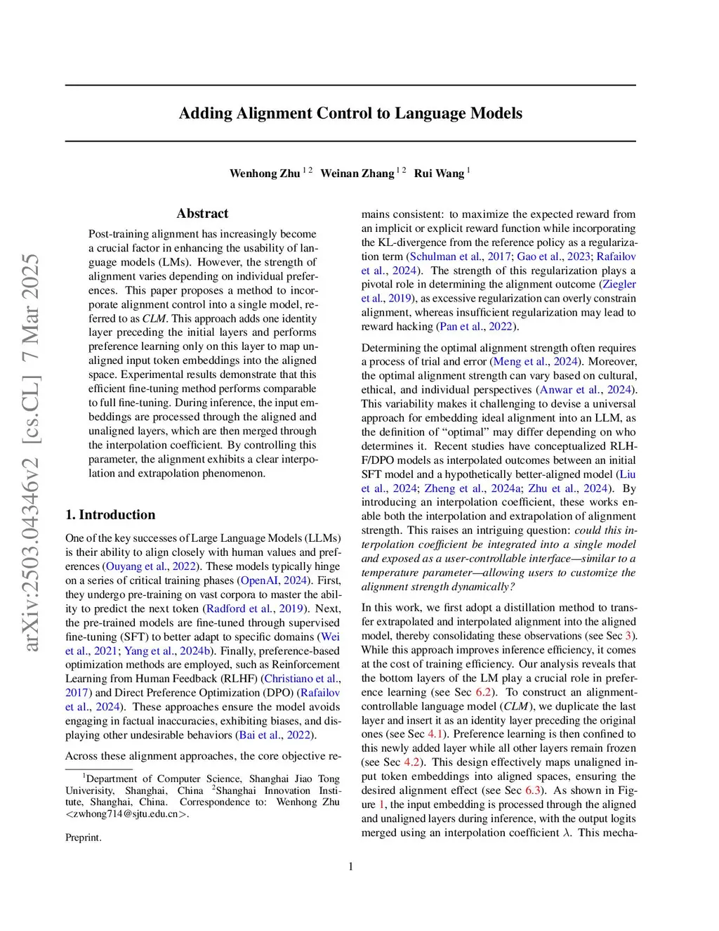 Post-training alignment has increasingly become a crucial factor in enhancing the usability of language models (LMs). However, the strength of alignment varies depending on individual preferences. This paper proposes a method to incorporate alignment control into a single model, referred to as CLM. This approach adds one identity layer preceding the initial layers and performs preference learning only on this layer to map unaligned input token embeddings into the aligned space. Experimental results demonstrate that this efficient fine-tuning method performs comparable to full fine-tuning. During inference, the input embeddings are processed through the aligned and unaligned layers, which are then merged through the interpolation coefficient. By controlling this parameter, the alignment exhibits a clear interpolation and extrapolation phenomenon.