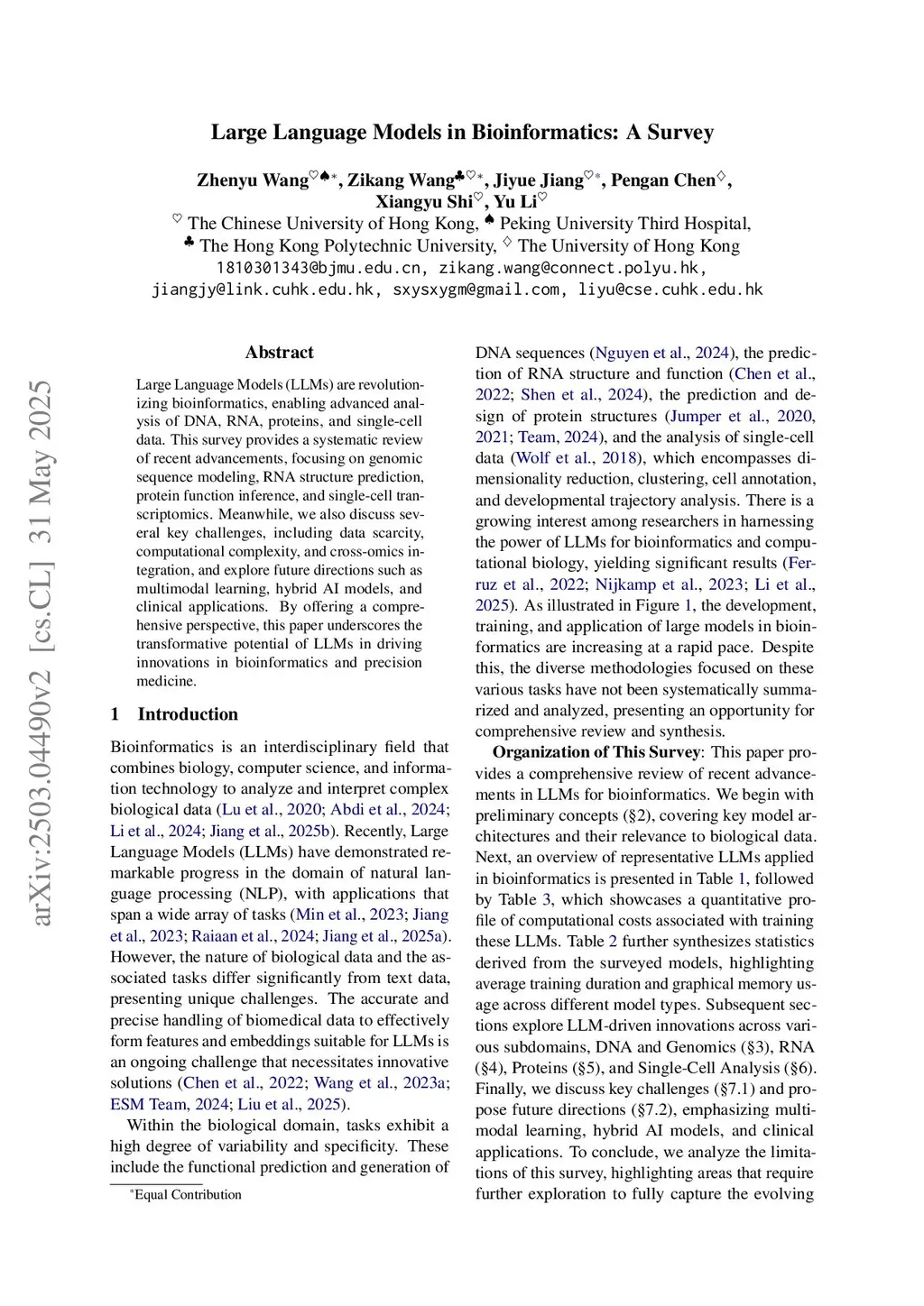 Large Language Models (LLMs) are revolutionizing bioinformatics, enabling advanced analysis of DNA, RNA, proteins, and single-cell data. This survey provides a systematic review of recent advancements, focusing on genomic sequence modeling, RNA structure prediction, protein function inference, and single-cell transcriptomics. Meanwhile, we also discuss several key challenges, including data scarcity, computational complexity, and cross-omics integration, and explore future directions such as multimodal learning, hybrid AI models, and clinical applications. By offering a comprehensive perspective, this paper underscores the transformative potential of LLMs in driving innovations in bioinformatics and precision medicine.