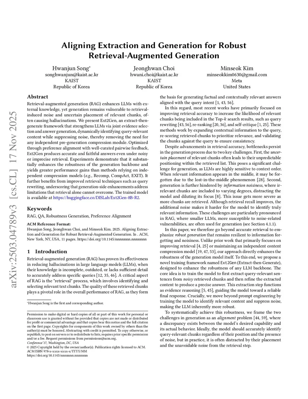 Retrieval-augmented generation (RAG) enhances LLMs with external knowledge, yet generation remains vulnerable to retrieval-induced noise and uncertain placement of relevant chunks, often causing hallucinations. We present Ext2Gen, an extract-then-generate framework that strengthens LLMs via joint evidence selection and answer generation, dynamically identifying query-relevant content while suppressing noise, thereby removing the need for any independent pre-generation compression module. Optimized through preference alignment with well-curated pairwise feedback, Ext2Gen produces accurate and faithful answers even under noisy or imprecise retrieval. Experiments demonstrate that it substantially enhances the robustness of the generation backbone and yields greater performance gains than methods relying on independent compression models, e.g., Recomp, CompAct, EXIT). It further benefits from improved retrieval techniques such as query rewriting, underscoring that generation-side enhancements address limitations that retrieval alone cannot overcome.