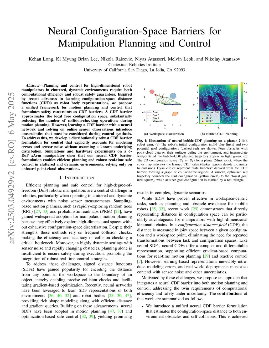 Planning and control for high-dimensional robot manipulators in cluttered, dynamic environments require both computational efficiency and robust safety guarantees. Inspired by recent advances in learning configuration-space distance functions (CDFs) as robot body representations, we propose a unified framework for motion planning and control that formulates safety constraints as CDF barriers. A CDF barrier approximates the local free configuration space, substantially reducing the number of collision-checking operations during motion planning. However, learning a CDF barrier with a neural network and relying on online sensor observations introduce uncertainties that must be considered during control synthesis. To address this, we develop a distributionally robust CDF barrier formulation for control that explicitly accounts for modeling errors and sensor noise without assuming a known underlying distribution. Simulations and hardware experiments on a 6-DoF xArm manipulator show that our neural CDF barrier formulation enables efficient planning and robust real-time safe control in cluttered and dynamic environments, relying only on onboard point-cloud observations.