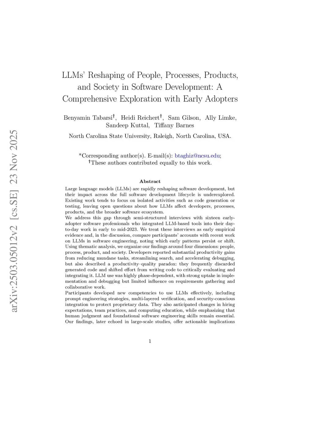Large language models (LLMs) are rapidly reshaping software development, but their impact across the software development lifecycle is underexplored. Existing work focuses on isolated activities such as code generation or testing, leaving open questions about how LLMs affect developers, processes, products, and the software ecosystem. We address this gap through semi-structured interviews with sixteen early-adopter software professionals who integrated LLM-based tools into their day-to-day work in early to mid-2023. We treat these interviews as early empirical evidence and compare participants' accounts with recent work on LLMs in software engineering, noting which early patterns persist or shift. Using thematic analysis, we organize findings around four dimensions: people, process, product, and society. Developers reported substantial productivity gains from reducing routine tasks, streamlining search, and accelerating debugging, but also described a productivity-quality paradox: they often discarded generated code and shifted effort from writing to critically evaluating and integrating it. LLM use was highly phase-dependent, with strong uptake in implementation and debugging but limited influence on requirements gathering and other collaborative work. Participants developed new competencies to use LLMs effectively, including prompt engineering strategies, layered verification, and secure integration to protect proprietary data. They anticipated changes in hiring expectations, team practices, and computing education, while emphasizing that human judgment and foundational software engineering skills remain essential. Our findings, later echoed in large-scale quantitative studies, offer actionable implications for developers, organizations, educators, and tool designers seeking to integrate LLMs responsibly into software practice today.