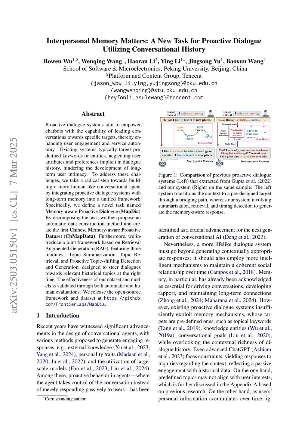 Proactive dialogue systems aim to empower chatbots with the capability of leading conversations towards specific targets, thereby enhancing user engagement and service autonomy. Existing systems typically target pre-defined keywords or entities, neglecting user attributes and preferences implicit in dialogue history, hindering the development of long-term user intimacy. To address these challenges, we take a radical step towards building a more human-like conversational agent by integrating proactive dialogue systems with long-term memory into a unified framework. Specifically, we define a novel task named Memory-aware Proactive Dialogue (MapDia). By decomposing the task, we then propose an automatic data construction method and create the first Chinese Memory-aware Proactive Dataset (ChMapData). Furthermore, we introduce a joint framework based on Retrieval Augmented Generation (RAG), featuring three modules: Topic Summarization, Topic Retrieval, and Proactive Topic-shifting Detection and Generation, designed to steer dialogues towards relevant historical topics at the right time. The effectiveness of our dataset and models is validated through both automatic and human evaluations. We release the open-source framework and dataset atthis https URL.