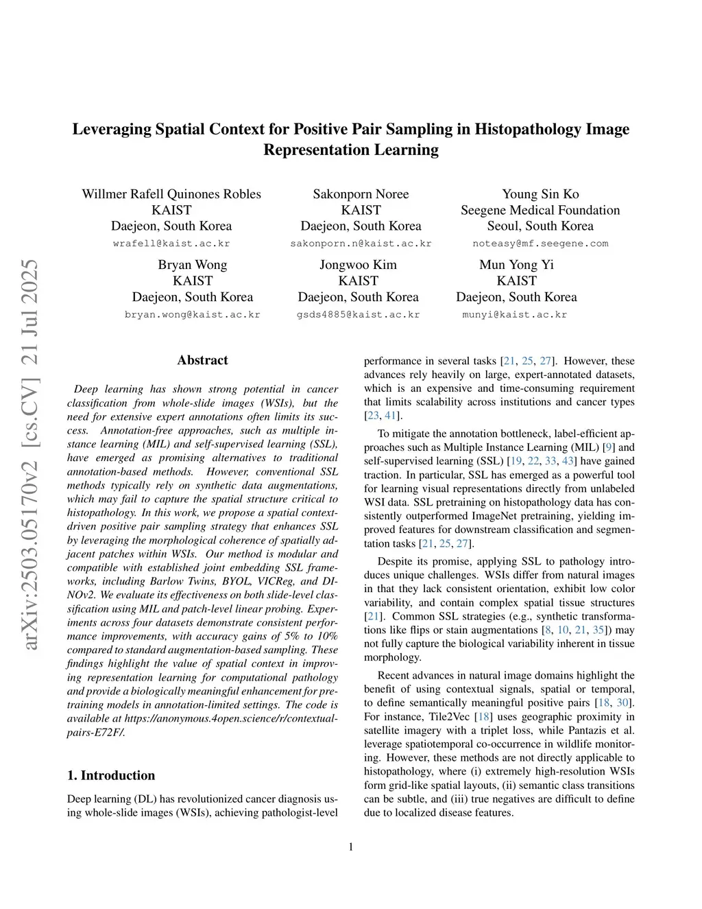 Deep learning has shown strong potential in cancer classification from whole-slide images (WSIs), but the need for extensive expert annotations often limits its success. Annotation-free approaches, such as multiple instance learning (MIL) and self-supervised learning (SSL), have emerged as promising alternatives to traditional annotation-based methods. However, conventional SSL methods typically rely on synthetic data augmentations, which may fail to capture the spatial structure critical to histopathology. In this work, we propose a spatial context-driven positive pair sampling strategy that enhances SSL by leveraging the morphological coherence of spatially adjacent patches within WSIs. Our method is modular and compatible with established joint embedding SSL frameworks, including Barlow Twins, BYOL, VICReg, and DINOv2. We evaluate its effectiveness on both slide-level classification using MIL and patch-level linear probing. Experiments across four datasets demonstrate consistent performance improvements, with accuracy gains of 5\% to 10\% compared to standard augmentation-based sampling. These findings highlight the value of spatial context in improving representation learning for computational pathology and provide a biologically meaningful enhancement for pretraining models in annotation-limited settings. The code is available atthis https URL.