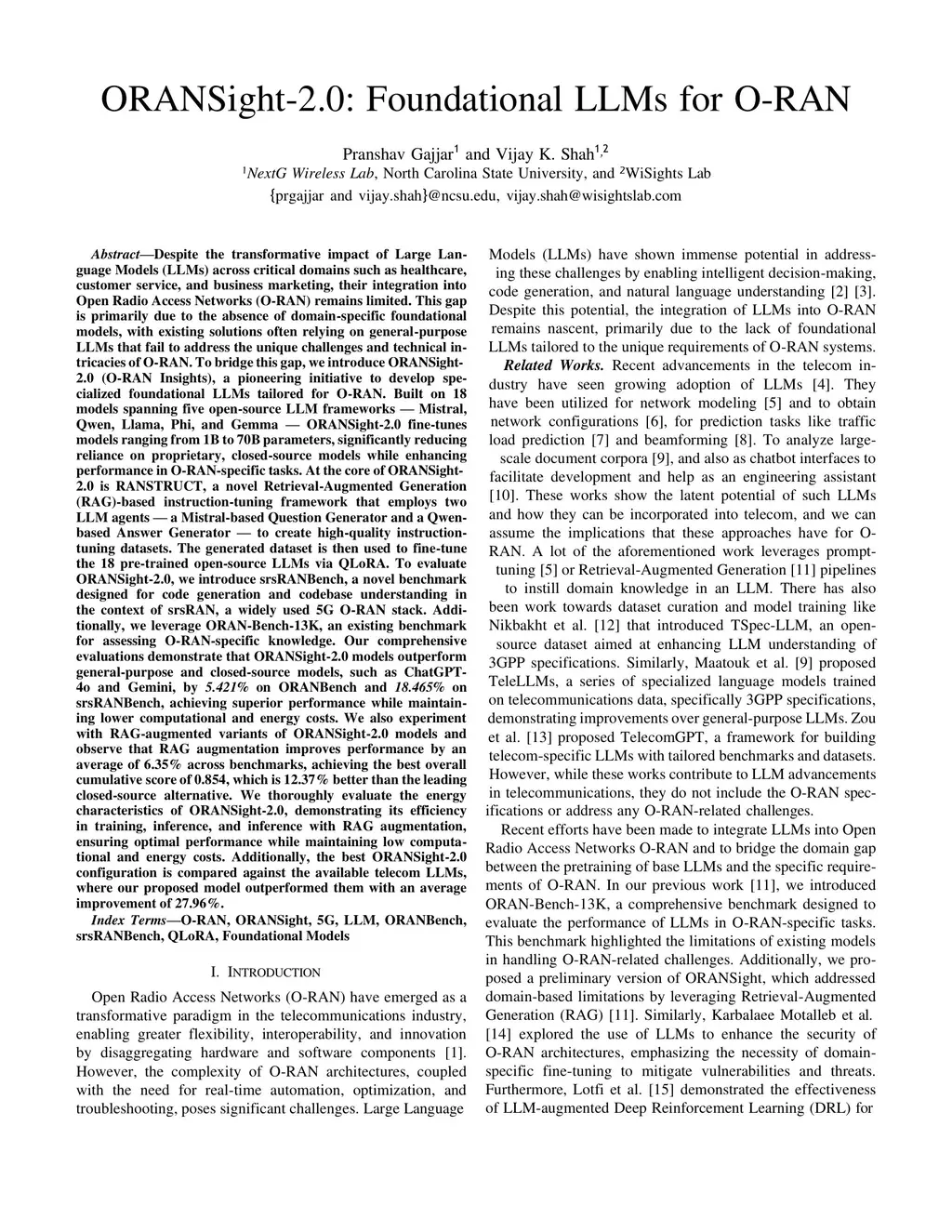 Despite the transformative impact of Large Language Models (LLMs) across critical domains such as healthcare, customer service, and business marketing, their integration into Open Radio Access Networks (O-RAN) remains limited. This gap is primarily due to the absence of domain-specific foundational models, with existing solutions often relying on general-purpose LLMs that fail to address the unique challenges and technical intricacies of O-RAN. To bridge this gap, we introduce ORANSight-2.0 (O-RAN Insights), a pioneering initiative to develop specialized foundational LLMs tailored for O-RAN. Built on 18 models spanning five open-source LLM frameworks -- Mistral, Qwen, Llama, Phi, and Gemma -- ORANSight-2.0 fine-tunes models ranging from 1B to 70B parameters, significantly reducing reliance on proprietary, closed-source models while enhancing performance in O-RAN-specific tasks. At the core of ORANSight-2.0 is RANSTRUCT, a novel Retrieval-Augmented Generation (RAG)-based instruction-tuning framework that employs two LLM agents -- a Mistral-based Question Generator and a Qwen-based Answer Generator -- to create high-quality instruction-tuning datasets. The generated dataset is then used to fine-tune the 18 pre-trained open-source LLMs via QLoRA. To evaluate ORANSight-2.0, we introduce srsRANBench, a novel benchmark designed for code generation and codebase understanding in the context of srsRAN, a widely used 5G O-RAN stack.