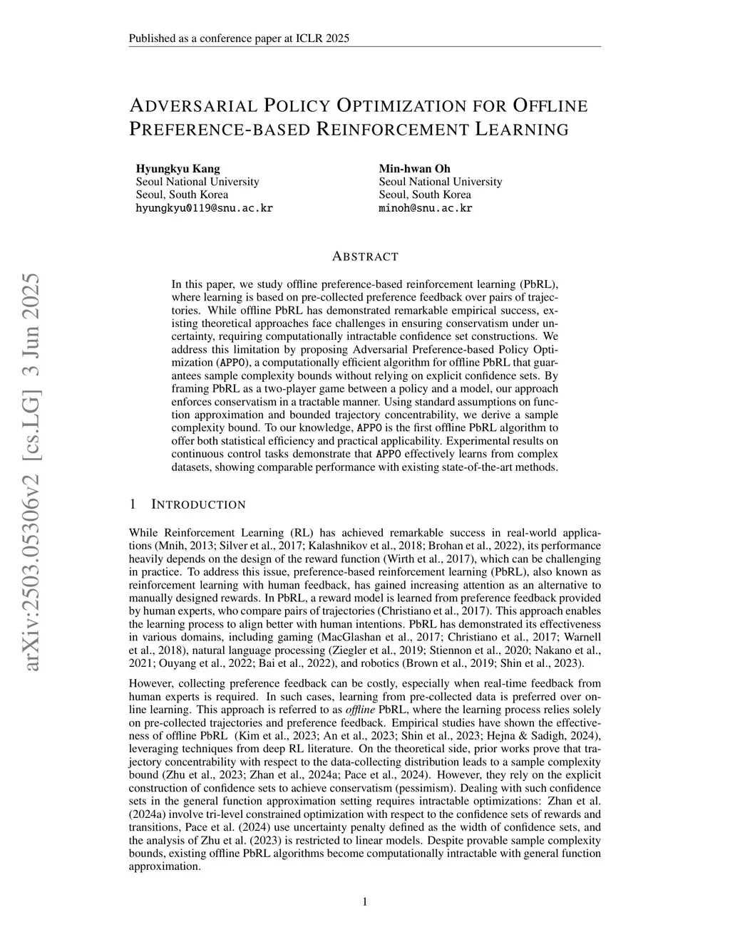 In this paper, we study offline preference-based reinforcement learning (PbRL), where learning is based on pre-collected preference feedback over pairs of trajectories. While offline PbRL has demonstrated remarkable empirical success, existing theoretical approaches face challenges in ensuring conservatism under uncertainty, requiring computationally intractable confidence set constructions. We address this limitation by proposing Adversarial Preference-based Policy Optimization (APPO), a computationally efficient algorithm for offline PbRL that guarantees sample complexity bounds without relying on explicit confidence sets. By framing PbRL as a two-player game between a policy and a model, our approach enforces conservatism in a tractable manner. Using standard assumptions on function approximation and bounded trajectory concentrability, we derive a sample complexity bound. To our knowledge, APPO is the first offline PbRL algorithm to offer both statistical efficiency and practical applicability. Experimental results on continuous control tasks demonstrate that APPO effectively learns from complex datasets, showing comparable performance with existing state-of-the-art methods.
