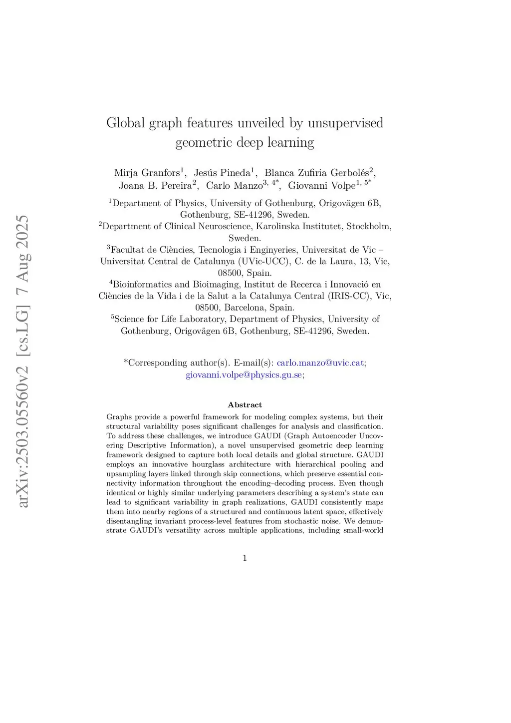 Graphs provide a powerful framework for modeling complex systems, but their structural variability poses significant challenges for analysis and classification. To address these challenges, we introduce GAUDI (Graph Autoencoder Uncovering Descriptive Information), a novel unsupervised geometric deep learning framework designed to capture both local details and global structure. GAUDI employs an innovative hourglass architecture with hierarchical pooling and upsampling layers linked through skip connections, which preserve essential connectivity information throughout the encoding-decoding process. Even though identical or highly similar underlying parameters describing a system's state can lead to significant variability in graph realizations, GAUDI consistently maps them into nearby regions of a structured and continuous latent space, effectively disentangling invariant process-level features from stochastic noise. We demonstrate GAUDI's versatility across multiple applications, including small-world networks modeling, characterization of protein assemblies from super-resolution microscopy, analysis of collective motion in the Vicsek model, and identification of age-related changes in brain connectivity. Comparison with related approaches highlights GAUDI's superior performance in analyzing complex graphs, providing new insights into emergent phenomena across diverse scientific domains.