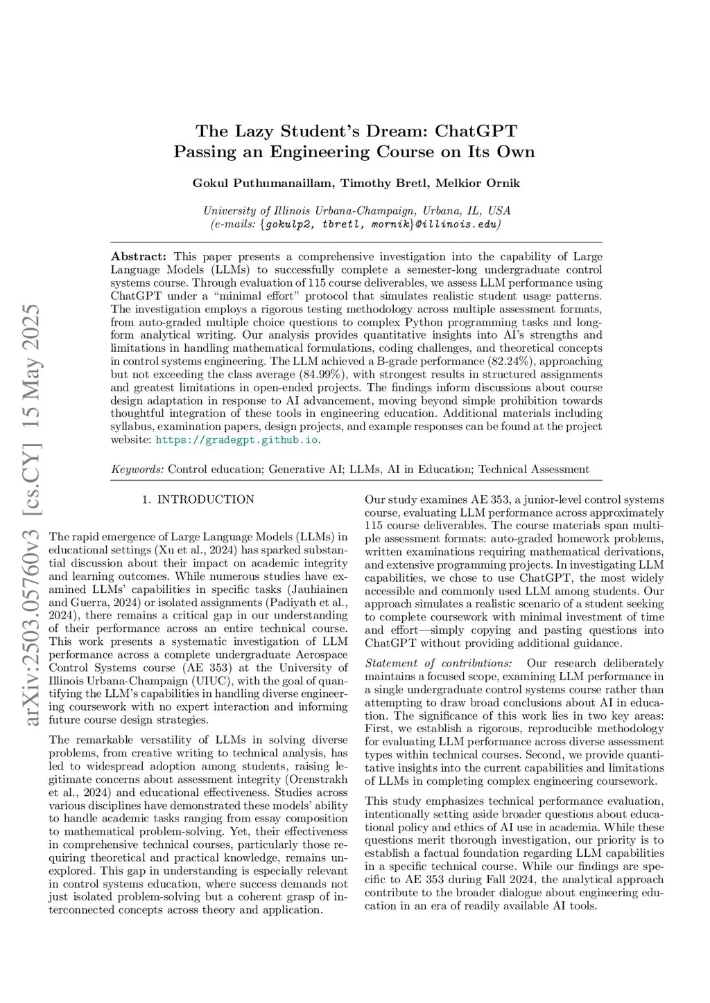 This paper presents a comprehensive investigation into the capability of Large Language Models (LLMs) to successfully complete a semester-long undergraduate control systems course. Through evaluation of 115 course deliverables, we assess LLM performance using ChatGPT under a "minimal effort" protocol that simulates realistic student usage patterns. The investigation employs a rigorous testing methodology across multiple assessment formats, from auto-graded multiple choice questions to complex Python programming tasks and long-form analytical writing. Our analysis provides quantitative insights into AI's strengths and limitations in handling mathematical formulations, coding challenges, and theoretical concepts in control systems engineering. The LLM achieved a B-grade performance (82.24\%), approaching but not exceeding the class average (84.99\%), with strongest results in structured assignments and greatest limitations in open-ended projects. The findings inform discussions about course design adaptation in response to AI advancement, moving beyond simple prohibition towards thoughtful integration of these tools in engineering education. Additional materials including syllabus, examination papers, design projects, and example responses can be found at the project website:this https URL.