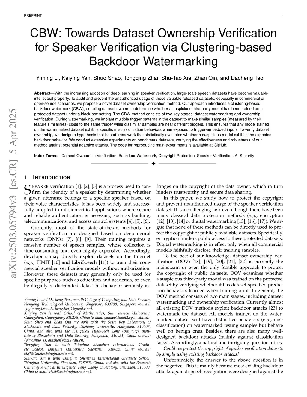 CBW: Towards Dataset Ownership Verification for Speaker Verification via Clustering-based Backdoor Watermarking
