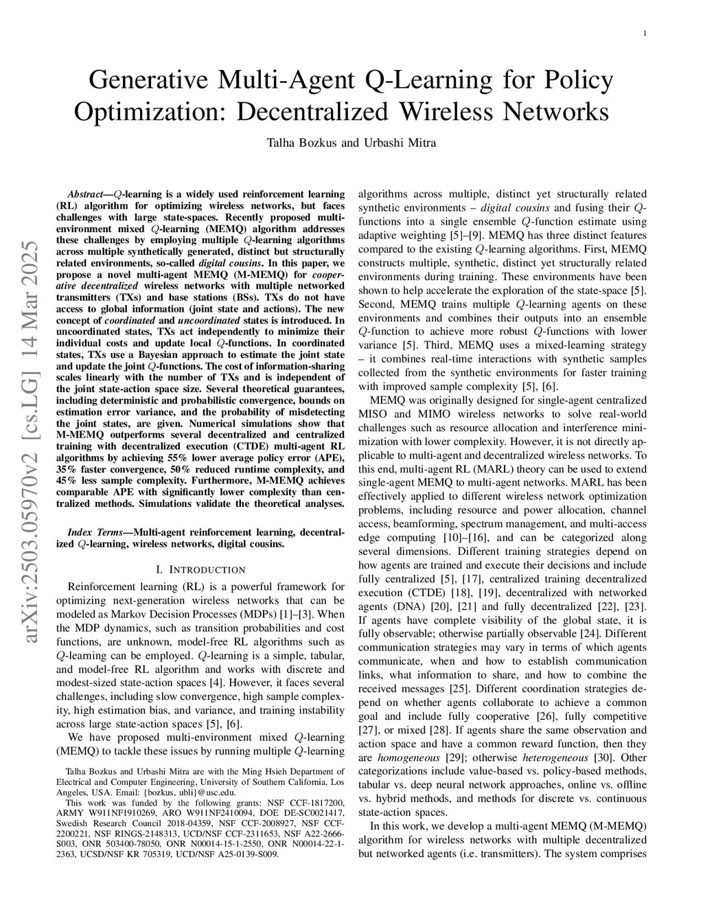 Q-learning is a widely used reinforcement learning (RL) algorithm for optimizing wireless networks, but faces challenges with large state-spaces. Recently proposed multi-environment mixed Q-learning (MEMQ) algorithm addresses these challenges by employing multiple Q-learning algorithms across multiple synthetically generated, distinct but structurally related environments, so-called digital cousins. In this paper, we propose a novel multi-agent MEMQ (M-MEMQ) for cooperative decentralized wireless networks with multiple networked transmitters (TXs) and base stations (BSs). TXs do not have access to global information (joint state and actions). The new concept of coordinated and uncoordinated states is introduced. In uncoordinated states, TXs act independently to minimize their individual costs and update local Q-functions. In coordinated states, TXs use a Bayesian approach to estimate the joint state and update the joint Q-functions. The cost of information-sharing scales linearly with the number of TXs and is independent of the joint state-action space size. Several theoretical guarantees, including deterministic and probabilistic convergence, bounds on estimation error variance, and the probability of misdetecting the joint states, are given. Numerical simulations show that M-MEMQ outperforms several decentralized and centralized training with decentralized execution (CTDE) multi-agent RL algorithms by achieving 60% lower average policy error (APE), 40% faster convergence, 45% reduced runtime complexity, and 40% less sample complexity. Furthermore, M-MEMQ achieves comparable APE with significantly lower complexity than centralized methods. Simulations validate the theoretical analyses.
