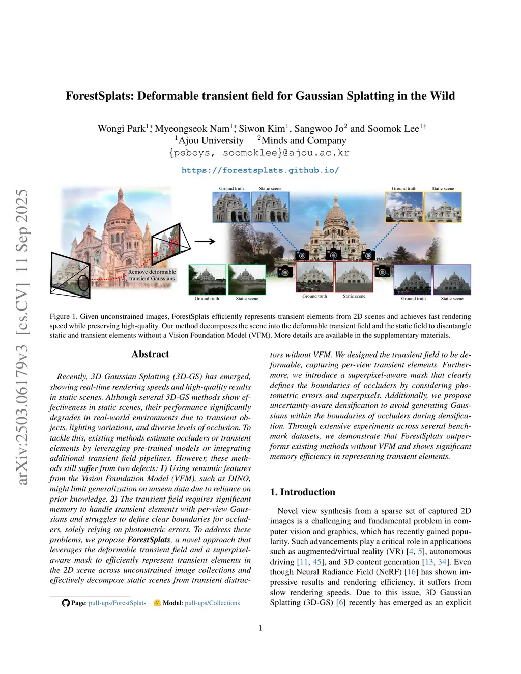 Recently, 3D Gaussian Splatting (3D-GS) has emerged, showing real-time rendering speeds and high-quality results in static scenes. Although 3D-GS shows effectiveness in static scenes, their performance significantly degrades in real-world environments due to transient objects, lighting variations, and diverse levels of occlusion. To tackle this, existing methods estimate occluders or transient elements by leveraging pre-trained models or integrating additional transient field pipelines. However, these methods still suffer from two defects: 1) Using semantic features from the Vision Foundation model (VFM) causes additional computational costs. 2) The transient field requires significant memory to handle transient elements with per-view Gaussians and struggles to define clear boundaries for occluders, solely relying on photometric errors. To address these problems, we propose ForestSplats, a novel approach that leverages the deformable transient field and a superpixel-aware mask to efficiently represent transient elements in the 2D scene across unconstrained image collections and effectively decompose static scenes from transient distractors without VFM. We designed the transient field to be deformable, capturing per-view transient elements. Furthermore, we introduce a superpixel-aware mask that clearly defines the boundaries of occluders by considering photometric errors and superpixels. Additionally, we propose uncertainty-aware densification to avoid generating Gaussians within the boundaries of occluders during densification. Through extensive experiments across several benchmark datasets, we demonstrate that ForestSplats outperforms existing methods without VFM and shows significant memory efficiency in representing transient elements.
