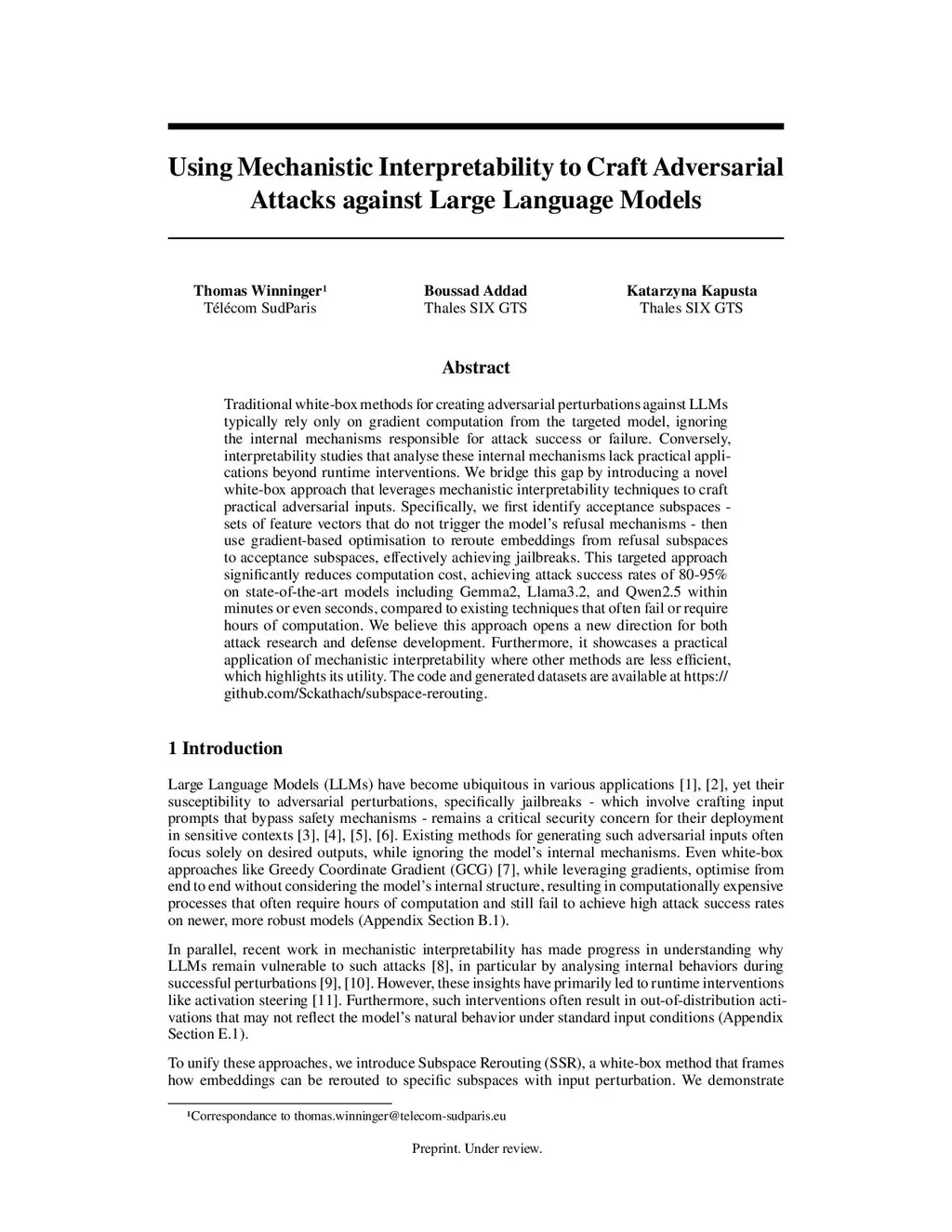 Traditional white-box methods for creating adversarial perturbations against LLMs typically rely only on gradient computation from the targeted model, ignoring the internal mechanisms responsible for attack success or failure. Conversely, interpretability studies that analyze these internal mechanisms lack practical applications beyond runtime interventions. We bridge this gap by introducing a novel white-box approach that leverages mechanistic interpretability techniques to craft practical adversarial inputs. Specifically, we first identify acceptance subspaces - sets of feature vectors that do not trigger the model's refusal mechanisms - then use gradient-based optimization to reroute embeddings from refusal subspaces to acceptance subspaces, effectively achieving jailbreaks. This targeted approach significantly reduces computation cost, achieving attack success rates of 80-95\% on state-of-the-art models including Gemma2, Llama3.2, and Qwen2.5 within minutes or even seconds, compared to existing techniques that often fail or require hours of computation. We believe this approach opens a new direction for both attack research and defense development. Furthermore, it showcases a practical application of mechanistic interpretability where other methods are less efficient, which highlights its utility. The code and generated datasets are available atthis https URL.