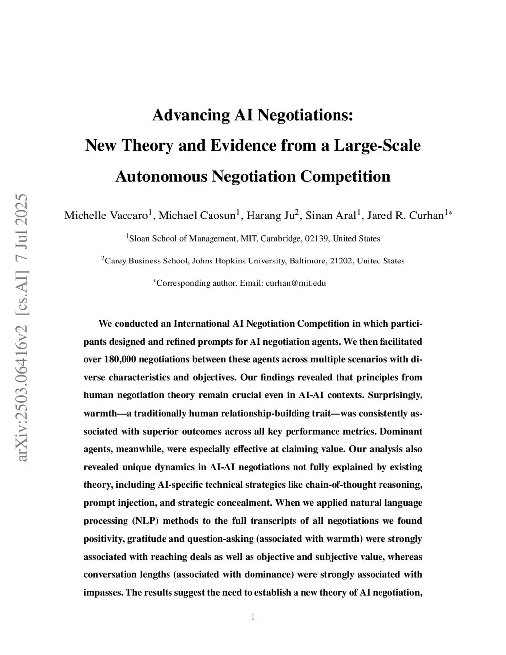 We conducted an International AI Negotiation Competition in which participants designed and refined prompts for AI negotiation agents. We then facilitated over 180,000 negotiations between these agents across multiple scenarios with diverse characteristics and objectives. Our findings revealed that principles from human negotiation theory remain crucial even in AI-AI contexts. Surprisingly, warmth -- a traditionally human relationship-building trait -- was consistently associated with superior outcomes across all key performance metrics. Dominant agents, meanwhile, were especially effective at claiming value. Our analysis also revealed unique dynamics in AI-AI negotiations not fully explained by existing theory, including AI-specific technical strategies like chain-of-thought reasoning and prompt injection. When we applied natural language processing (NLP) methods to the full transcripts of all negotiations, we found positivity, gratitude, and question-asking (associated with warmth) were strongly associated with reaching deals as well as objective and subjective value, whereas conversation lengths (associated with dominance) were strongly associated with impasses. The results suggest the need to establish a new theory of AI negotiation, which integrates classic negotiation theory with AI-specific negotiation theories to better understand autonomous negotiations and optimize agent performance.