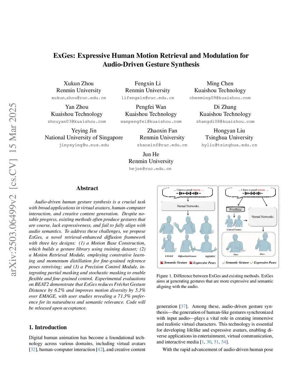 Audio-driven human gesture synthesis is a crucial task with broad applications in virtual avatars, human-computer interaction, and creative content generation. Despite notable progress, existing methods often produce gestures that are coarse, lack expressiveness, and fail to fully align with audio semantics. To address these challenges, we propose ExGes, a novel retrieval-enhanced diffusion framework with three key designs: (1) a Motion Base Construction, which builds a gesture library using training dataset; (2) a Motion Retrieval Module, employing constrative learning and momentum distillation for fine-grained reference poses retreiving; and (3) a Precision Control Module, integrating partial masking and stochastic masking to enable flexible and fine-grained control. Experimental evaluations on BEAT2 demonstrate that ExGes reduces Fréchet Gesture Distance by 6.2\% and improves motion diversity by 5.3\% over EMAGE, with user studies revealing a 71.3\% preference for its naturalness and semantic relevance. Code will be released upon acceptance.