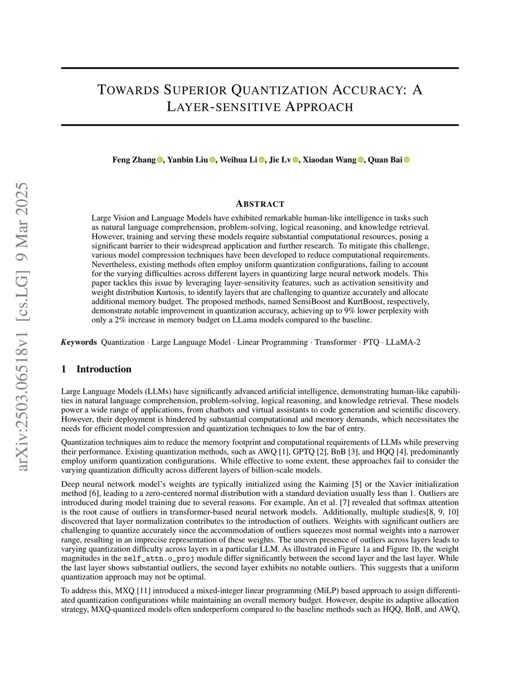 Large Vision and Language Models have exhibited remarkable human-like intelligence in tasks such as natural language comprehension, problem-solving, logical reasoning, and knowledge retrieval. However, training and serving these models require substantial computational resources, posing a significant barrier to their widespread application and further research. To mitigate this challenge, various model compression techniques have been developed to reduce computational requirements. Nevertheless, existing methods often employ uniform quantization configurations, failing to account for the varying difficulties across different layers in quantizing large neural network models. This paper tackles this issue by leveraging layer-sensitivity features, such as activation sensitivity and weight distribution Kurtosis, to identify layers that are challenging to quantize accurately and allocate additional memory budget. The proposed methods, named SensiBoost and KurtBoost, respectively, demonstrate notable improvement in quantization accuracy, achieving up to 9% lower perplexity with only a 2% increase in memory budget on LLama models compared to the baseline.