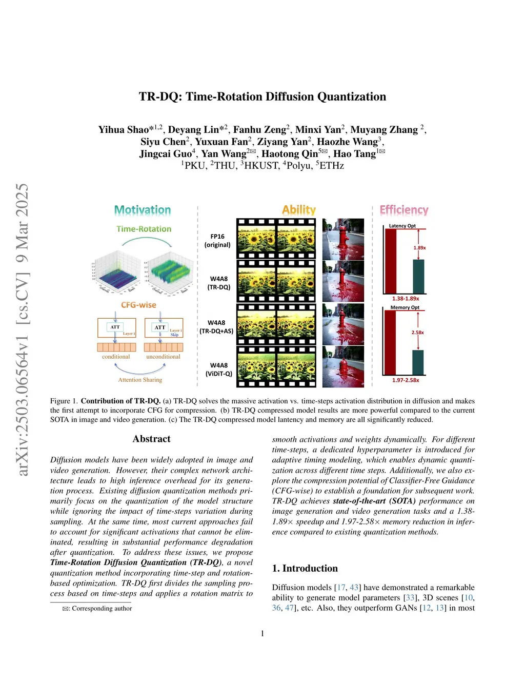 Diffusion models have been widely adopted in image and video generation. However, their complex network architecture leads to high inference overhead for its generation process. Existing diffusion quantization methods primarily focus on the quantization of the model structure while ignoring the impact of time-steps variation during sampling. At the same time, most current approaches fail to account for significant activations that cannot be eliminated, resulting in substantial performance degradation after quantization. To address these issues, we propose Time-Rotation Diffusion Quantization (TR-DQ), a novel quantization method incorporating time-step and rotation-based optimization. TR-DQ first divides the sampling process based on time-steps and applies a rotation matrix to smooth activations and weights dynamically. For different time-steps, a dedicated hyperparameter is introduced for adaptive timing modeling, which enables dynamic quantization across different time steps. Additionally, we also explore the compression potential of Classifier-Free Guidance (CFG-wise) to establish a foundation for subsequent work. TR-DQ achieves state-of-the-art (SOTA) performance on image generation and video generation tasks and a 1.38-1.89x speedup and 1.97-2.58x memory reduction in inference compared to existing quantization methods.