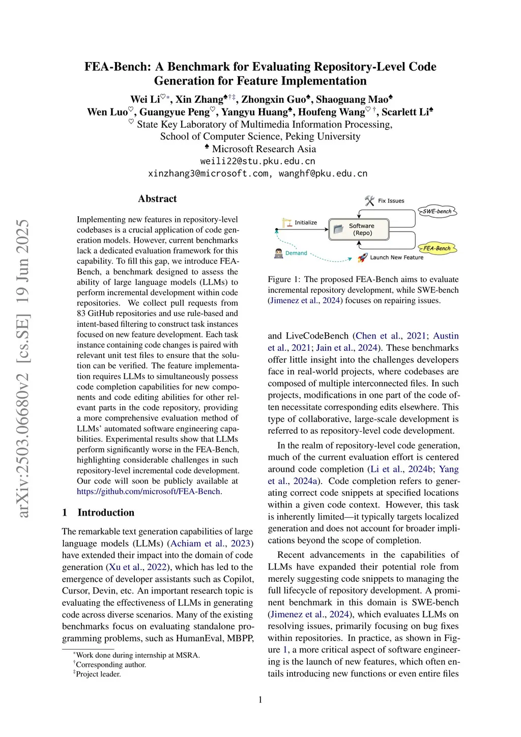 FEA-Bench: A Benchmark for Evaluating Repository-Level Code Generation for Feature Implementation