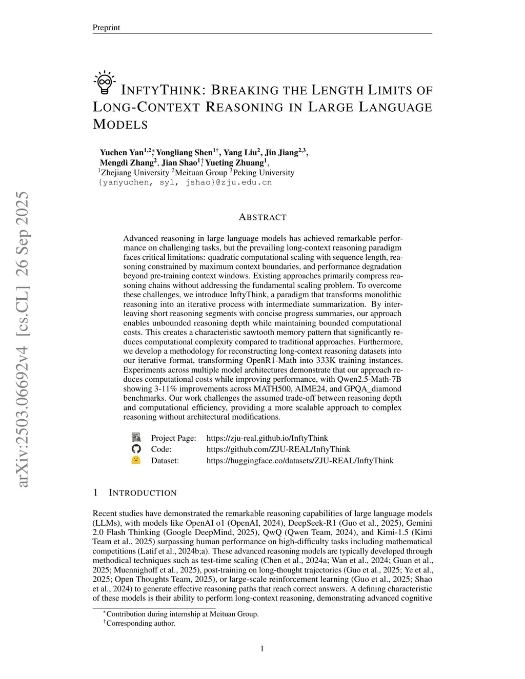 Advanced reasoning in large language models has achieved remarkable performance on challenging tasks, but the prevailing long-context reasoning paradigm faces critical limitations: quadratic computational scaling with sequence length, reasoning constrained by maximum context boundaries, and performance degradation beyond pre-training context windows. Existing approaches primarily compress reasoning chains without addressing the fundamental scaling problem. To overcome these challenges, we introduce InftyThink, a paradigm that transforms monolithic reasoning into an iterative process with intermediate summarization. By interleaving short reasoning segments with concise progress summaries, our approach enables unbounded reasoning depth while maintaining bounded computational costs. This creates a characteristic sawtooth memory pattern that significantly reduces computational complexity compared to traditional approaches. Furthermore, we develop a methodology for reconstructing long-context reasoning datasets into our iterative format, transforming OpenR1-Math into 333K training instances. Experiments across multiple model architectures demonstrate that our approach reduces computational costs while improving performance, with Qwen2.5-Math-7B showing 3-11% improvements across MATH500, AIME24, and GPQA_diamond benchmarks. Our work challenges the assumed trade-off between reasoning depth and computational efficiency, providing a more scalable approach to complex reasoning without architectural modifications.