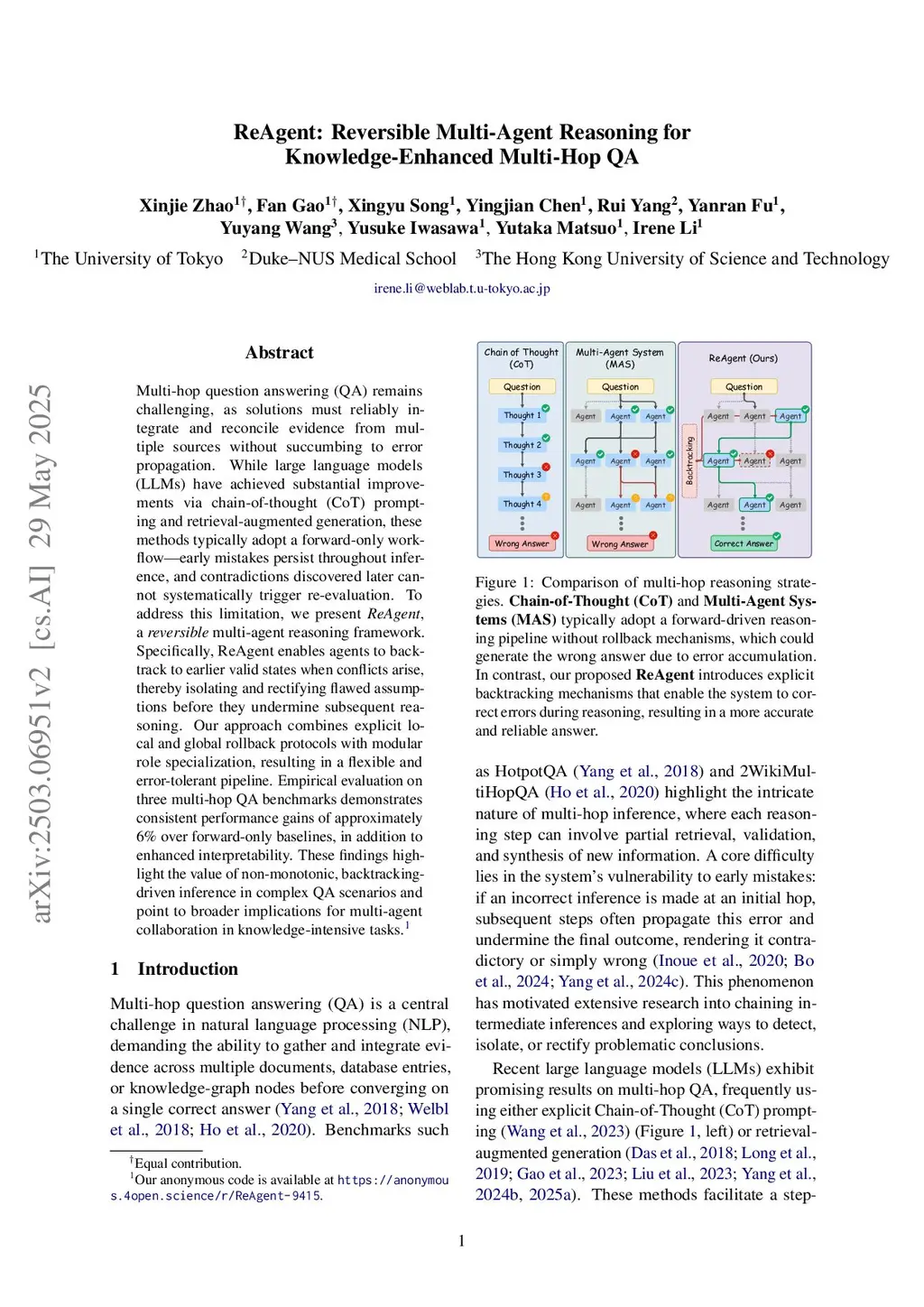 Recent advances in large language models (LLMs) have significantly improved multi-hop question answering (QA) through direct Chain-of-Thought (CoT) reasoning. However, the irreversible nature of CoT leads to error accumulation, making it challenging to correct mistakes in multi-hop reasoning. This paper introduces ReAgent: a Reversible multi-Agent collaborative framework augmented with explicit backtracking mechanisms, enabling reversible multi-hop reasoning. By incorporating text-based retrieval, information aggregation and validation, our system can detect and correct errors mid-reasoning, leading to more robust and interpretable QA outcomes. The framework and experiments serve as a foundation for future work on error-tolerant QA systems. Empirical evaluations across three benchmarks indicate ReAgent's efficacy, yielding average about 6\% improvements against baseline models.