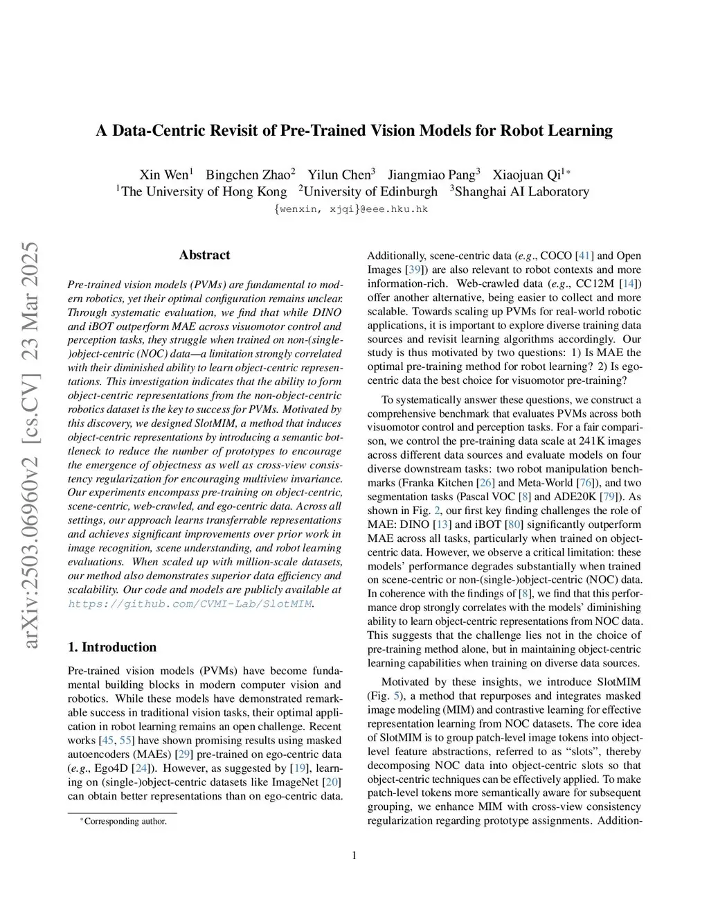 Pre-trained vision models (PVMs) are fundamental to modern robotics, yet their optimal configuration remains unclear. Through systematic evaluation, we find that while DINO and iBOT outperform MAE across visuomotor control and perception tasks, they struggle when trained on non-(single-)object-centric (NOC) data--a limitation strongly correlated with their diminished ability to learn object-centric representations. This investigation indicates that the ability to form object-centric representations from the non-object-centric robotics dataset is the key to success for PVMs. Motivated by this discovery, we designed SlotMIM, a method that induces object-centric representations by introducing a semantic bottleneck to reduce the number of prototypes to encourage the emergence of objectness as well as cross-view consistency regularization for encouraging multiview invariance. Our experiments encompass pre-training on object-centric, scene-centric, web-crawled, and ego-centric data. Across all settings, our approach learns transferrable representations and achieves significant improvements over prior work in image recognition, scene understanding, and robot learning evaluations. When scaled up with million-scale datasets, our method also demonstrates superior data efficiency and scalability. Our code and models are publicly available atthis https URL.