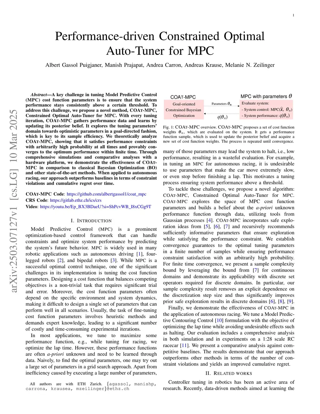 A key challenge in tuning Model Predictive Control (MPC) cost function parameters is to ensure that the system performance stays consistently above a certain threshold. To address this challenge, we propose a novel method, COAT-MPC, Constrained Optimal Auto-Tuner for MPC. With every tuning iteration, COAT-MPC gathers performance data and learns by updating its posterior belief. It explores the tuning parameters' domain towards optimistic parameters in a goal-directed fashion, which is key to its sample efficiency. We theoretically analyze COAT-MPC, showing that it satisfies performance constraints with arbitrarily high probability at all times and provably converges to the optimum performance within finite time. Through comprehensive simulations and comparative analyses with a hardware platform, we demonstrate the effectiveness of COAT-MPC in comparison to classical Bayesian Optimization (BO) and other state-of-the-art methods. When applied to autonomous racing, our approach outperforms baselines in terms of constraint violations and cumulative regret over time.