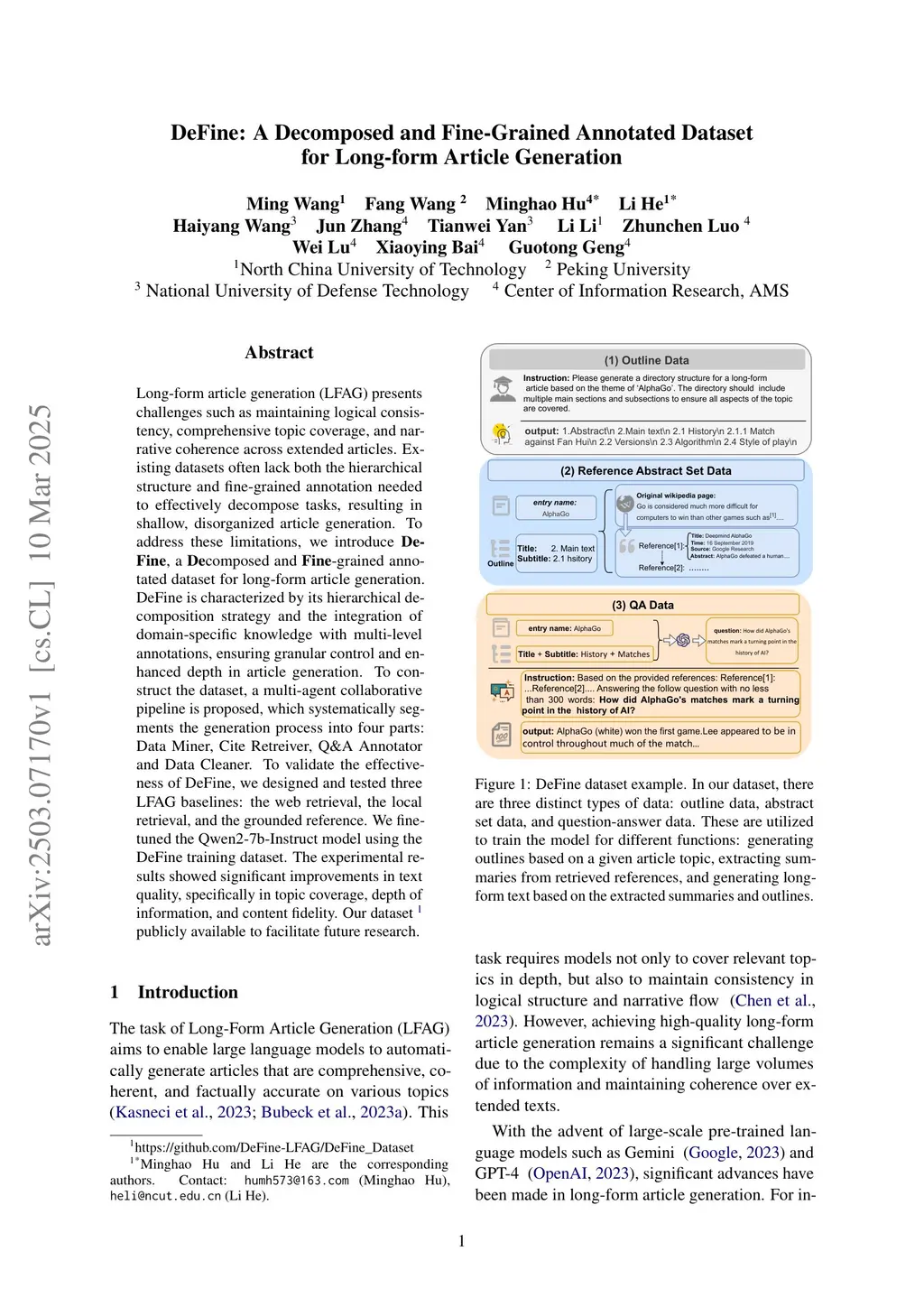 Long-form article generation (LFAG) presents challenges such as maintaining logical consistency, comprehensive topic coverage, and narrative coherence across extended articles. Existing datasets often lack both the hierarchical structure and fine-grained annotation needed to effectively decompose tasks, resulting in shallow, disorganized article generation. To address these limitations, we introduce DeFine, a Decomposed and Fine-grained annotated dataset for long-form article generation. DeFine is characterized by its hierarchical decomposition strategy and the integration of domain-specific knowledge with multi-level annotations, ensuring granular control and enhanced depth in article generation. To construct the dataset, a multi-agent collaborative pipeline is proposed, which systematically segments the generation process into four parts: Data Miner, Cite Retreiver, Q&A Annotator and Data Cleaner. To validate the effectiveness of DeFine, we designed and tested three LFAG baselines: the web retrieval, the local retrieval, and the grounded reference. We fine-tuned the Qwen2-7b-Instruct model using the DeFine training dataset. The experimental results showed significant improvements in text quality, specifically in topic coverage, depth of information, and content fidelity. Our dataset publicly available to facilitate future research.