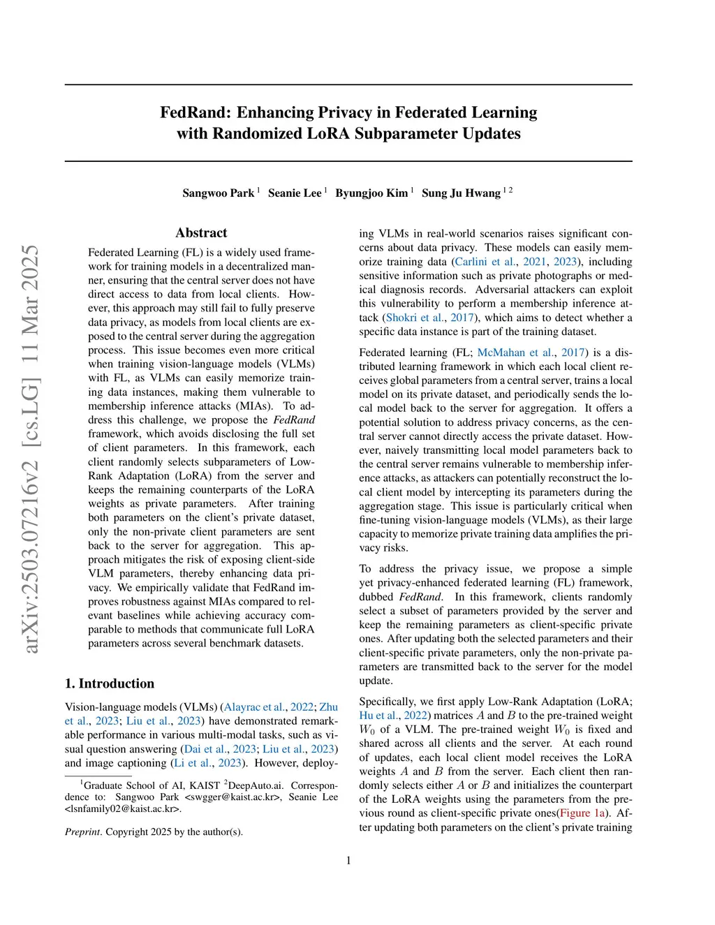 Federated Learning (FL) is a widely used framework for training models in a decentralized manner, ensuring that the central server does not have direct access to data from local clients. However, this approach may still fail to fully preserve data privacy, as models from local clients are exposed to the central server during the aggregation process. This issue becomes even more critical when training vision-language models (VLMs) with FL, as VLMs can easily memorize training data instances, making them vulnerable to membership inference attacks (MIAs). To address this challenge, we propose the FedRand framework, which avoids disclosing the full set of client parameters. In this framework, each client randomly selects subparameters of Low-Rank Adaptation (LoRA) from the server and keeps the remaining counterparts of the LoRA weights as private parameters. After training both parameters on the client's private dataset, only the non-private client parameters are sent back to the server for aggregation. This approach mitigates the risk of exposing client-side VLM parameters, thereby enhancing data privacy. We empirically validate that FedRand improves robustness against MIAs compared to relevant baselines while achieving accuracy comparable to methods that communicate full LoRA parameters across several benchmark datasets.