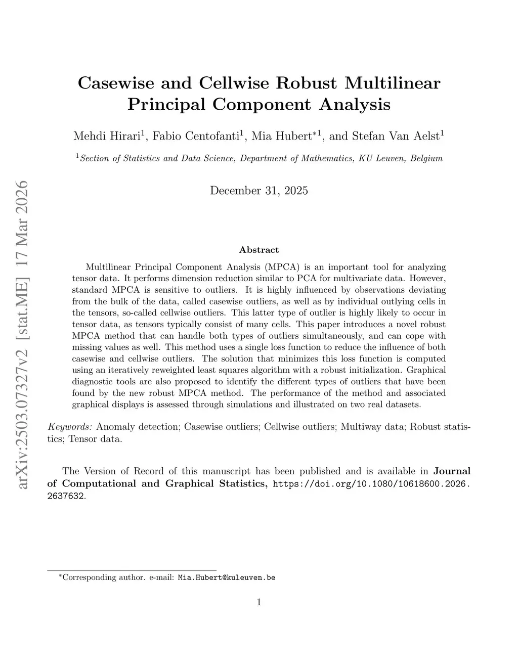 Multilinear Principal Component Analysis (MPCA) is an important tool for analyzing tensor data. It performs dimension reduction similar to PCA for multivariate data. However, standard MPCA is sensitive to outliers. It is highly influenced by observations deviating from the bulk of the data, called casewise outliers, as well as by individual outlying cells in the tensors, so-called cellwise outliers. This latter type of outlier is highly likely to occur in tensor data, as tensors typically consist of many cells. This paper introduces a novel robust MPCA method that can handle both types of outliers simultaneously, and can cope with missing values as well. This method uses a single loss function to reduce the influence of both casewise and cellwise outliers. The solution that minimizes this loss function is computed using an iteratively reweighted least squares algorithm with a robust initialization. Graphical diagnostic tools are also proposed to identify the different types of outliers that have been found by the new robust MPCA method. The performance of the method and associated graphical displays is assessed through simulations and illustrated on two real datasets.