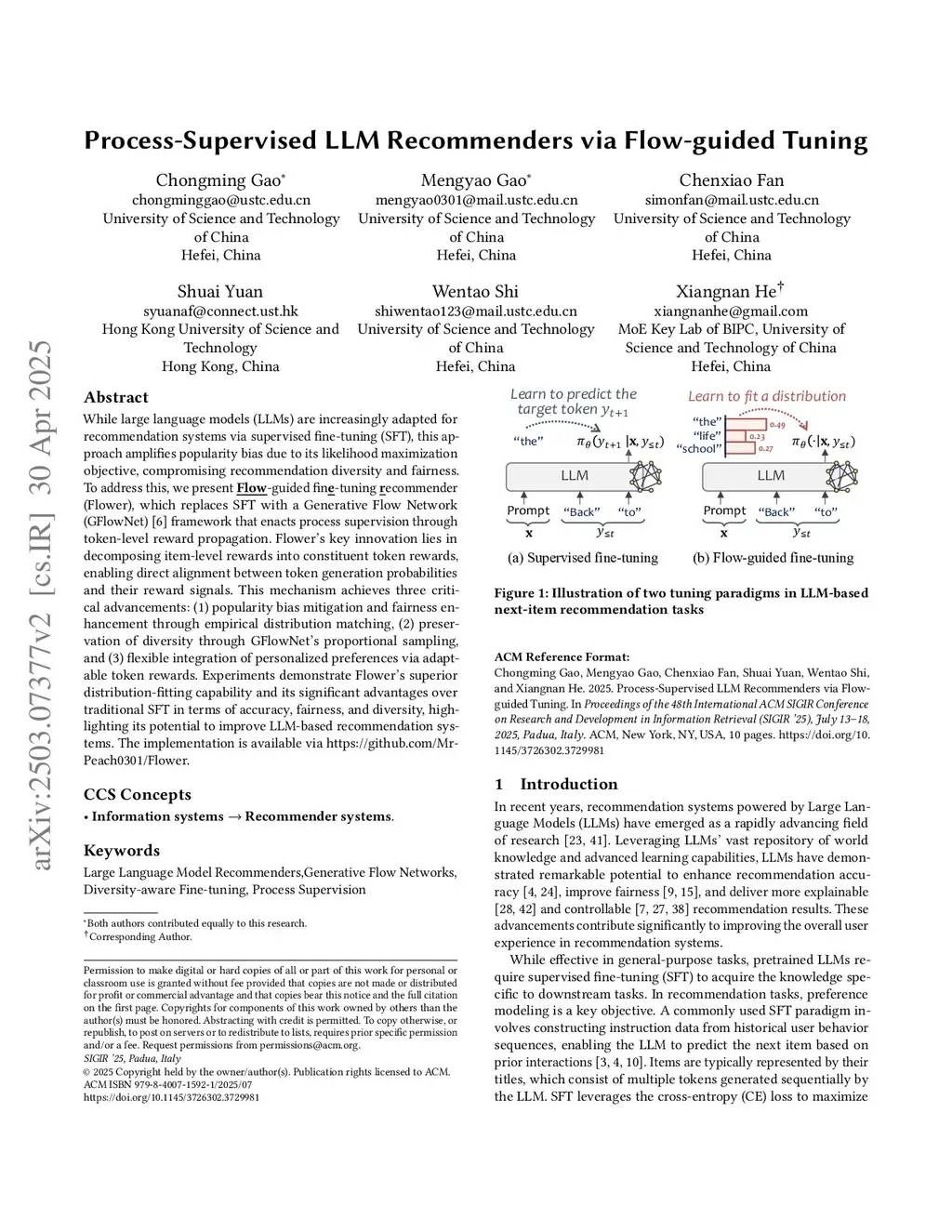 While large language models (LLMs) are increasingly adapted for recommendation systems via supervised fine-tuning (SFT), this approach amplifies popularity bias due to its likelihood maximization objective, compromising recommendation diversity and fairness. To address this, we present Flow-guided fine-tuning recommender (Flower), which replaces SFT with a Generative Flow Network (GFlowNet) framework that enacts process supervision through token-level reward propagation. Flower's key innovation lies in decomposing item-level rewards into constituent token rewards, enabling direct alignment between token generation probabilities and their reward signals. This mechanism achieves three critical advancements: (1) popularity bias mitigation and fairness enhancement through empirical distribution matching, (2) preservation of diversity through GFlowNet's proportional sampling, and (3) flexible integration of personalized preferences via adaptable token rewards. Experiments demonstrate Flower's superior distribution-fitting capability and its significant advantages over traditional SFT in terms of accuracy, fairness, and diversity, highlighting its potential to improve LLM-based recommendation systems. The implementation is available viathis https URL