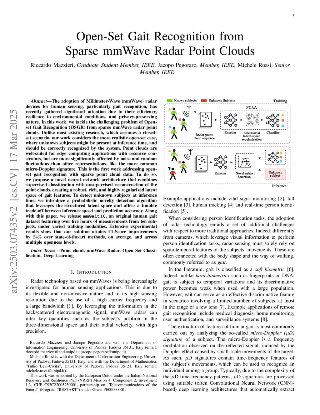 The adoption of Millimeter-Wave (mmWave) radar devices for human sensing, particularly gait recognition, has recently gathered significant attention due to their efficiency, resilience to environmental conditions, and privacy-preserving nature. In this work, we tackle the challenging problem of Open-set Gait Recognition (OSGR) from sparse mmWave radar point clouds. Unlike most existing research, which assumes a closed-set scenario, our work considers the more realistic open-set case, where unknown subjects might be present at inference time, and should be correctly recognized by the system. Point clouds are well-suited for edge computing applications with resource constraints, but are more significantly affected by noise and random fluctuations than other representations, like the more common micro-Doppler signature. This is the first work addressing open-set gait recognition with sparse point cloud data. To do so, we propose a novel neural network architecture that combines supervised classification with unsupervised reconstruction of the point clouds, creating a robust, rich, and highly regularized latent space of gait features. To detect unknown subjects at inference time, we introduce a probabilistic novelty detection algorithm that leverages the structured latent space and offers a tunable trade-off between inference speed and prediction accuracy. Along with this paper, we release mmGait10, an original human gait dataset featuring over five hours of measurements from ten subjects, under varied walking modalities. Extensive experimental results show that our solution attains F1-Score improvements by 24% over state-of-the-art methods adapted for point clouds, on average, and across multiple openness levels.