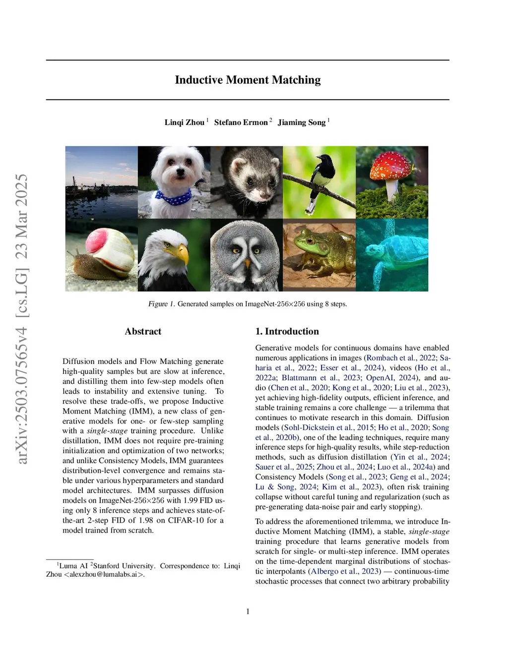 Diffusion models and Flow Matching generate high-quality samples but are slow at inference, and distilling them into few-step models often leads to instability and extensive tuning. To resolve these trade-offs, we propose Inductive Moment Matching (IMM), a new class of generative models for one- or few-step sampling with a single-stage training procedure. Unlike distillation, IMM does not require pre-training initialization and optimization of two networks; and unlike Consistency Models, IMM guarantees distribution-level convergence and remains stable under various hyperparameters and standard model architectures. IMM surpasses diffusion models on ImageNet-256x256 with 1.99 FID using only 8 inference steps and achieves state-of-the-art 2-step FID of 1.98 on CIFAR-10 for a model trained from scratch.