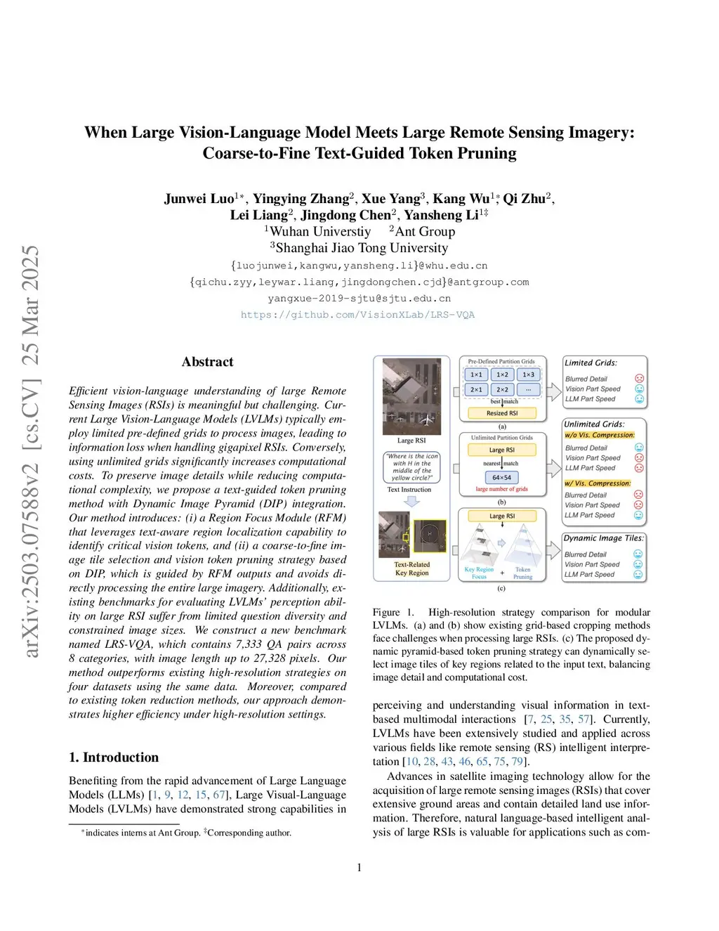 Efficient vision-language understanding of large Remote Sensing Images (RSIs) is meaningful but challenging. Current Large Vision-Language Models (LVLMs) typically employ limited pre-defined grids to process images, leading to information loss when handling gigapixel RSIs. Conversely, using unlimited grids significantly increases computational costs. To preserve image details while reducing computational complexity, we propose a text-guided token pruning method with Dynamic Image Pyramid (DIP) integration. Our method introduces: (i) a Region Focus Module (RFM) that leverages text-aware region localization capability to identify critical vision tokens, and (ii) a coarse-to-fine image tile selection and vision token pruning strategy based on DIP, which is guided by RFM outputs and avoids directly processing the entire large imagery. Additionally, existing benchmarks for evaluating LVLMs' perception ability on large RSI suffer from limited question diversity and constrained image sizes. We construct a new benchmark named LRS-VQA, which contains 7,333 QA pairs across 8 categories, with image length up to 27,328 pixels. Our method outperforms existing high-resolution strategies on four datasets using the same data. Moreover, compared to existing token reduction methods, our approach demonstrates higher efficiency under high-resolution settings. Dataset and code are inthis https URL.