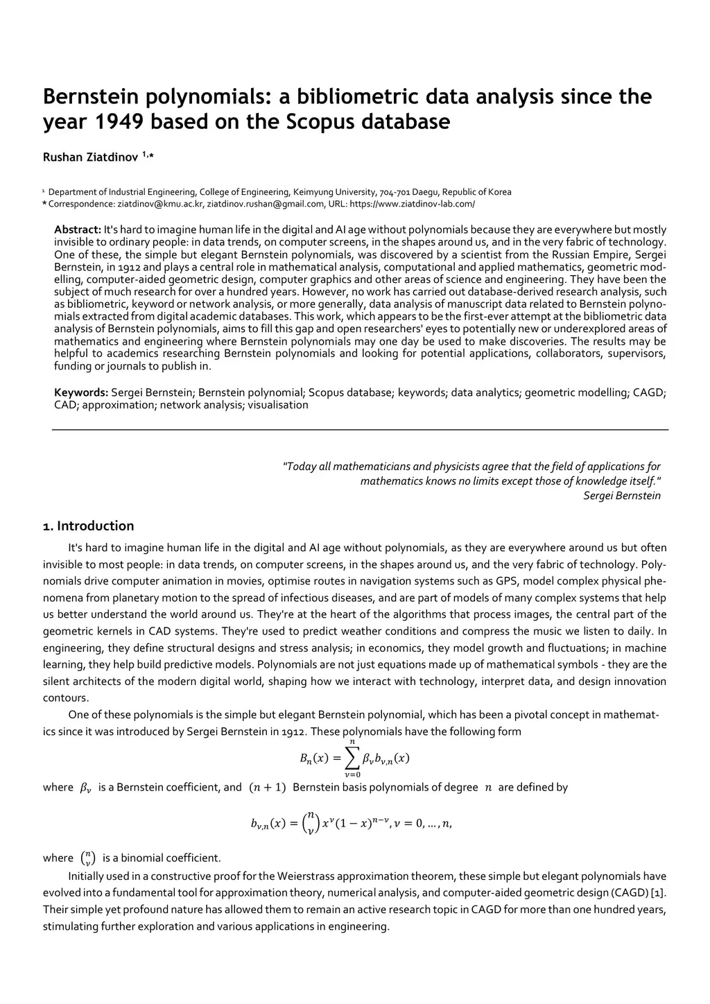It's hard to imagine human life in the digital and AI age without polynomials because they are everywhere but mostly invisible to ordinary people: in data trends, on computer screens, in the shapes around us, and in the very fabric of technology. One of these, the simple but elegant Bernstein polynomials, was discovered by a scientist from the Russian Empire, Sergei Bernstein, in 1912 and plays a central role in mathematical analysis, computational and applied mathematics, geometric modelling, computer-aided geometric design, computer graphics and other areas of science and engineering. They have been the sub-ject of much research for over a hundred years. However, no work has carried out database-derived research analysis, such as bibliometric, keyword or network analysis, or more generally, data analysis of manuscript data related to Bernstein polynomials extracted from digital academic databases. This work, which appears to be the first-ever attempt at the bibliometric data analysis of Bernstein polynomials, aims to fill this gap and open researchers' eyes to potentially new or underexplored areas of mathematics and engineering where Bernstein polynomials may one day be used to make discoveries. The results may be helpful to academics researching Bernstein polynomials and looking for potential applications, collaborators, supervisors, funding or journals to publish in.