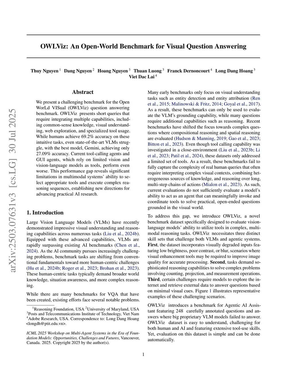 We present a challenging benchmark for the Open WorLd VISual question answering (OWLViz) task. OWLViz presents concise, unambiguous queries that require integrating multiple capabilities, including visual understanding, web exploration, and specialized tool usage. While humans achieve 69.2% accuracy on these intuitive tasks, even state-of-the-art VLMs struggle, with the best model, Gemini 2.0, achieving only 26.6% accuracy. Current agentic VLMs, which rely on limited vision and vision-language models as tools, perform even worse. This performance gap reveals significant limitations in multimodal systems' ability to select appropriate tools and execute complex reasoning sequences, establishing new directions for advancing practical AI research.