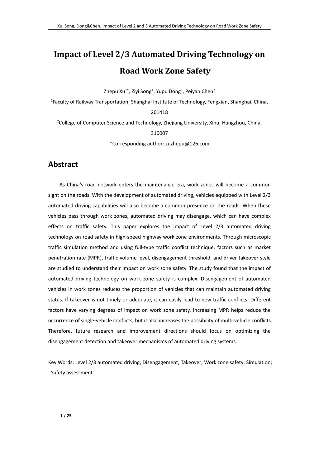 Impact of Level 2/3 Automated Driving Technology on Road Work Zone Safety