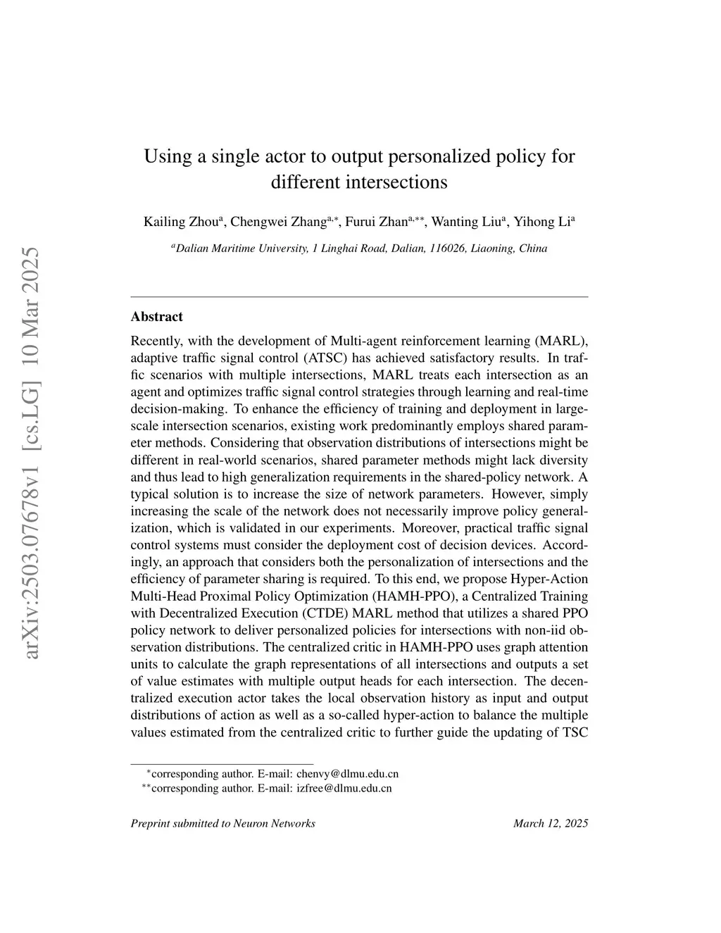 Using a single actor to output personalized policy for different intersections