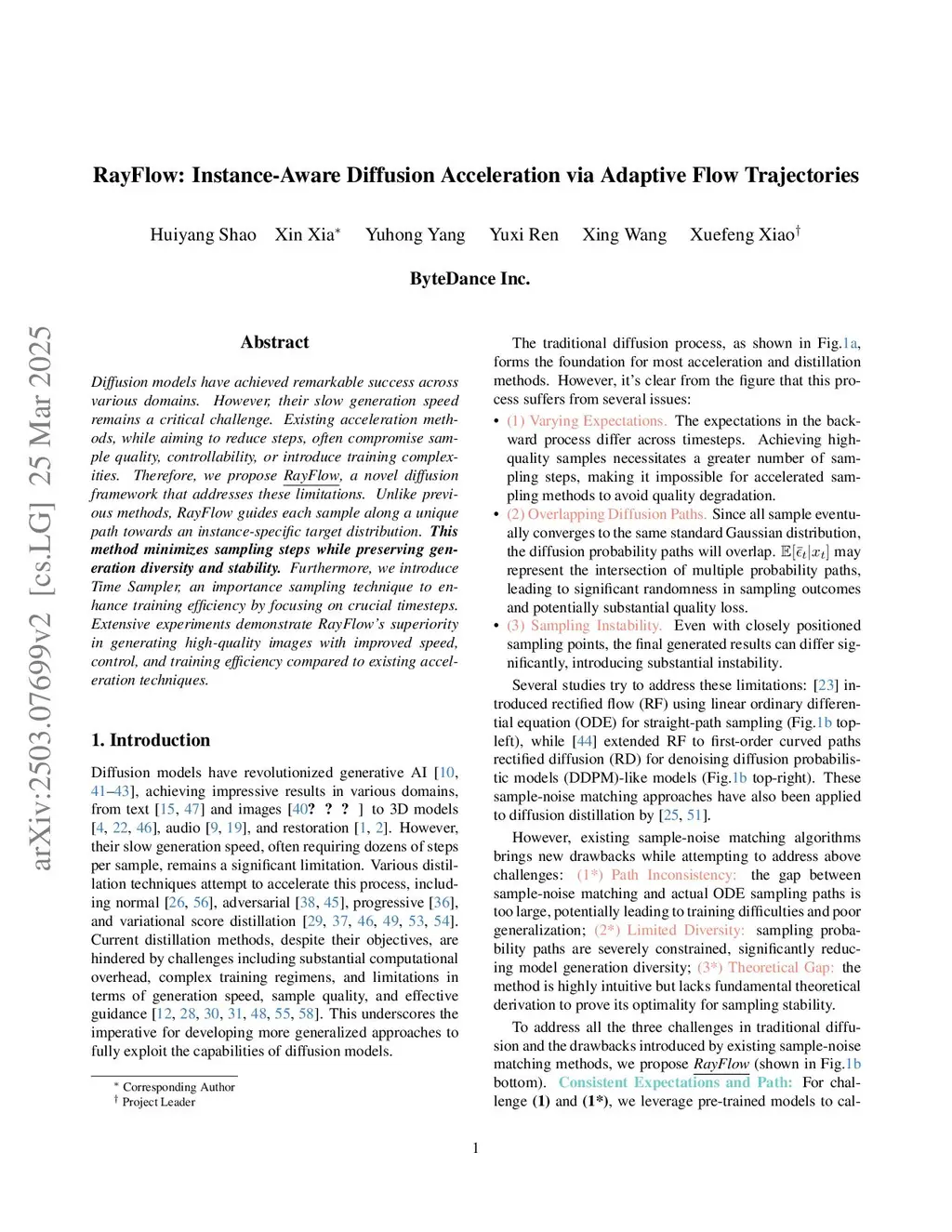 Diffusion models have achieved remarkable success across various domains. However, their slow generation speed remains a critical challenge. Existing acceleration methods, while aiming to reduce steps, often compromise sample quality, controllability, or introduce training complexities. Therefore, we propose RayFlow, a novel diffusion framework that addresses these limitations. Unlike previous methods, RayFlow guides each sample along a unique path towards an instance-specific target distribution. This method minimizes sampling steps while preserving generation diversity and stability. Furthermore, we introduce Time Sampler, an importance sampling technique to enhance training efficiency by focusing on crucial timesteps. Extensive experiments demonstrate RayFlow's superiority in generating high-quality images with improved speed, control, and training efficiency compared to existing acceleration techniques.