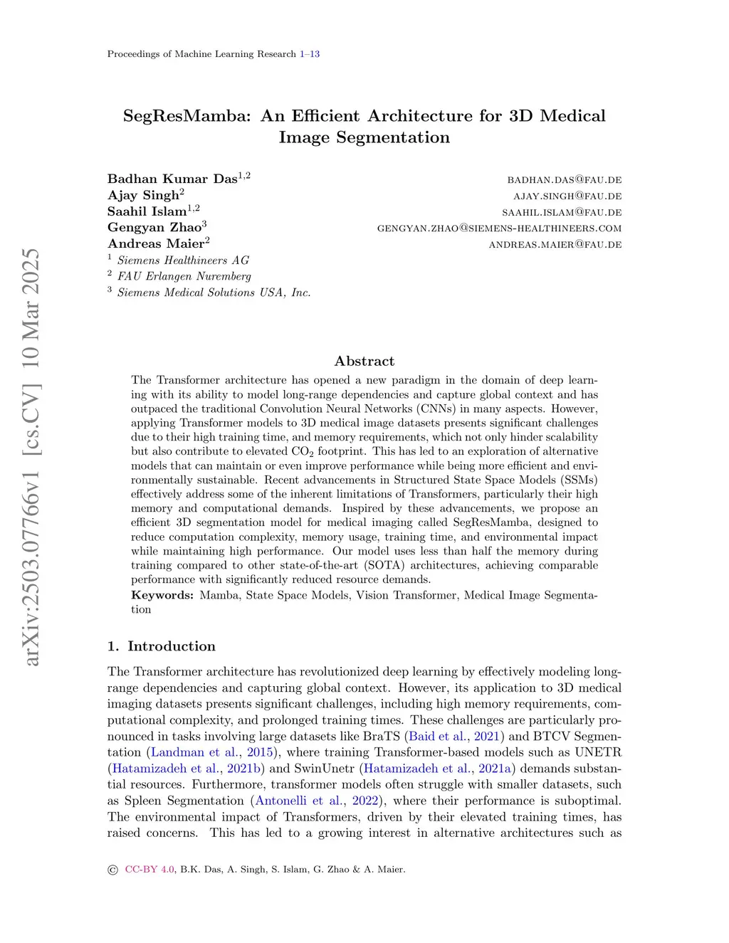 The Transformer architecture has opened a new paradigm in the domain of deep learning with its ability to model long-range dependencies and capture global context and has outpaced the traditional Convolution Neural Networks (CNNs) in many aspects. However, applying Transformer models to 3D medical image datasets presents significant challenges due to their high training time, and memory requirements, which not only hinder scalability but also contribute to elevated CO footprint. This has led to an exploration of alternative models that can maintain or even improve performance while being more efficient and environmentally sustainable. Recent advancements in Structured State Space Models (SSMs) effectively address some of the inherent limitations of Transformers, particularly their high memory and computational demands. Inspired by these advancements, we propose an efficient 3D segmentation model for medical imaging called SegResMamba, designed to reduce computation complexity, memory usage, training time, and environmental impact while maintaining high performance. Our model uses less than half the memory during training compared to other state-of-the-art (SOTA) architectures, achieving comparable performance with significantly reduced resource demands.