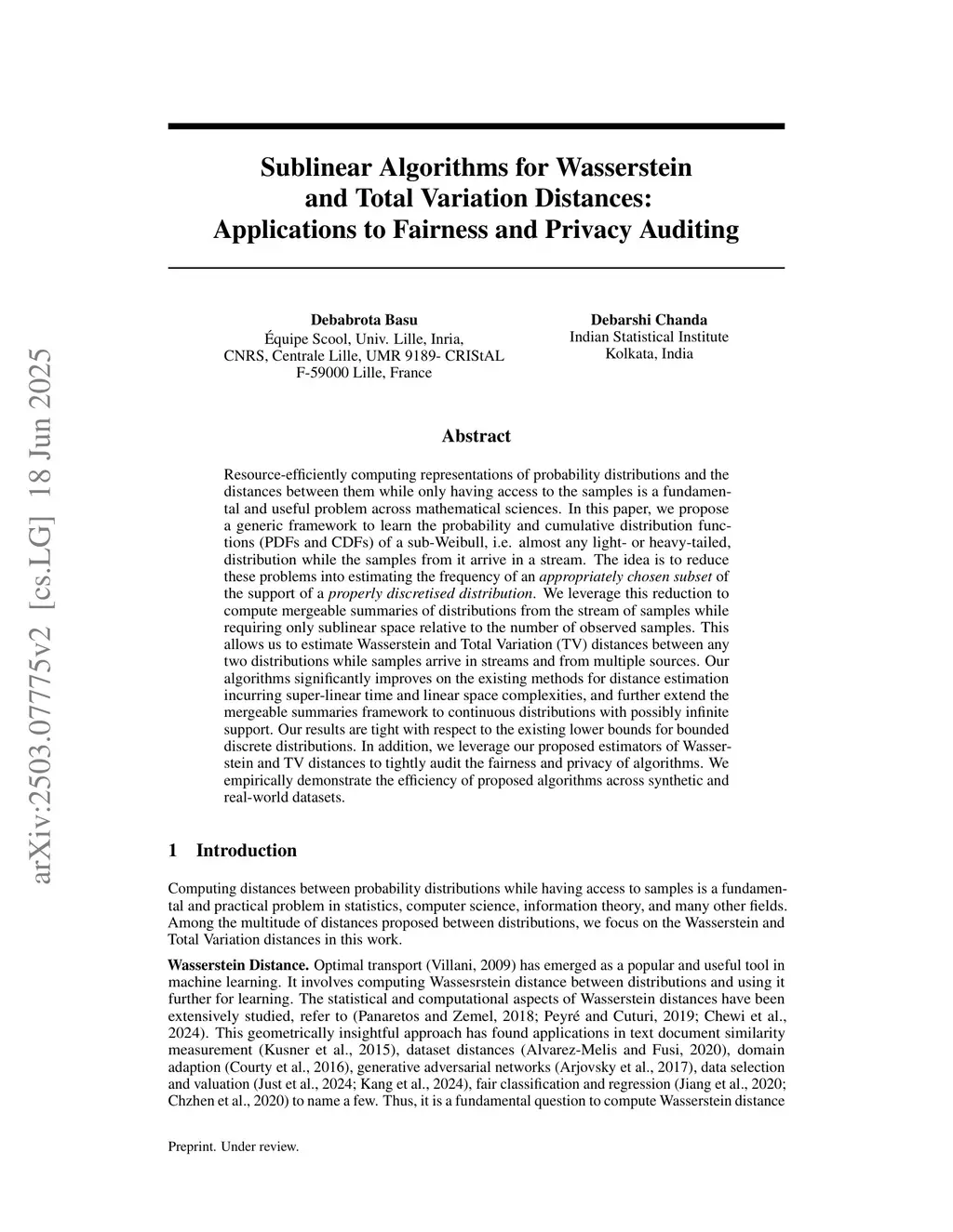Sublinear Algorithms for Wasserstein and Total Variation Distances: Applications to Fairness and Privacy Auditing